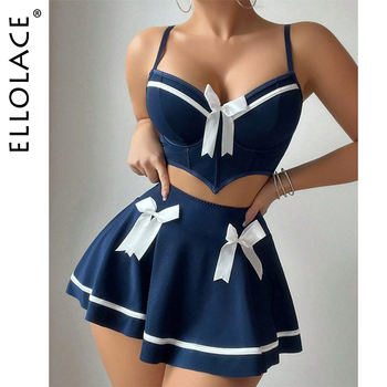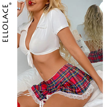Ellolace Halloween Lingeries Sexy Hot Student Cosplay Crop Top Thong Skirt 3PC Cute Plaid Discipline Hot Girl Party Costume