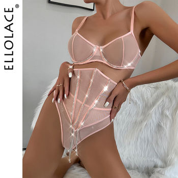 Ellolace Rhinestone Lingerie With Waistband Sheer Lace Sensual Underwear Glitter Tassels Naked Women Uncensored Sexy Intimate