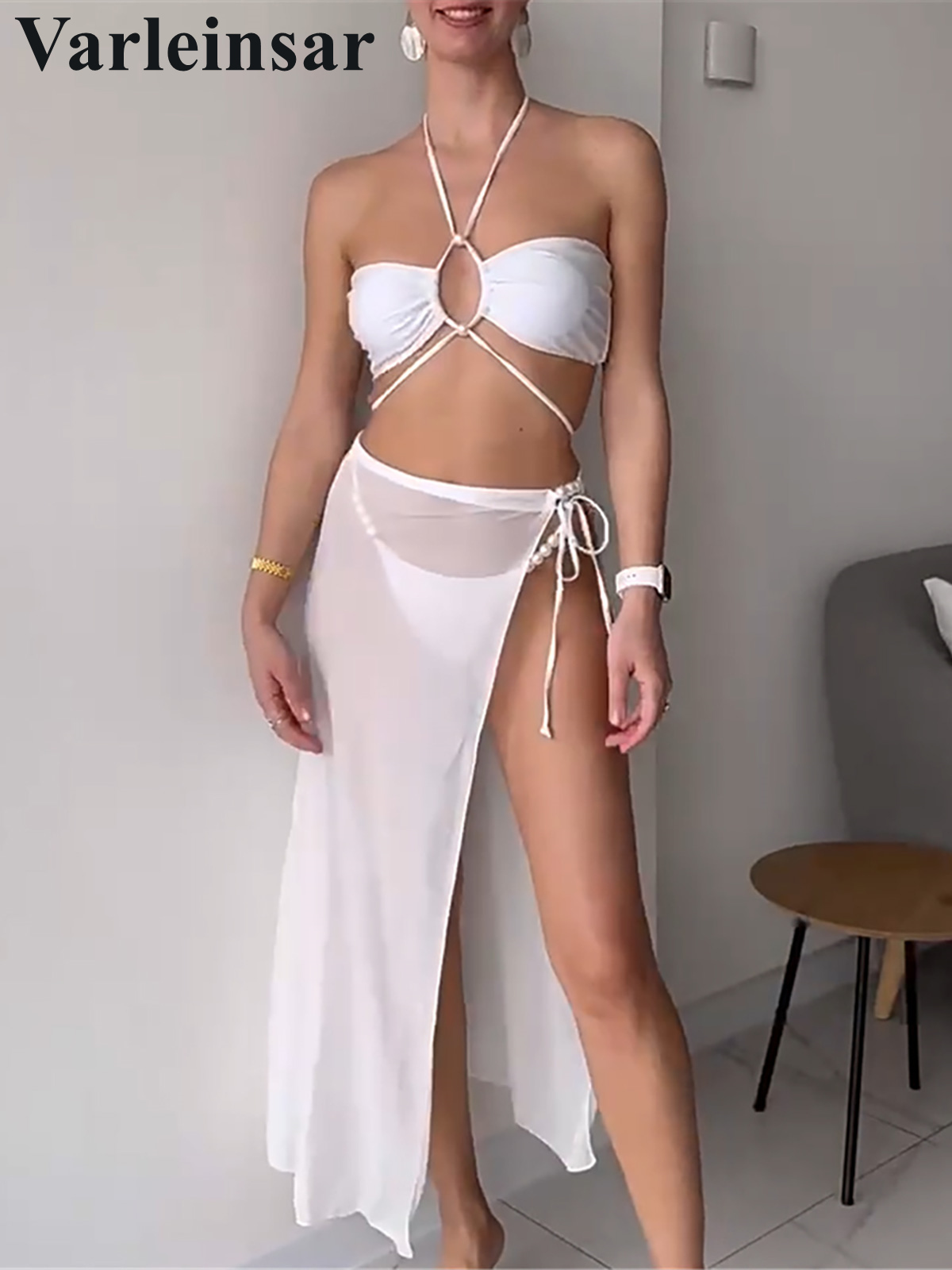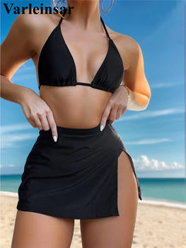 Female Swimsuit High Waist Bikini Women Swimwear Three-pieces Bikini set Short Sleeve Cover Ups Bather Bathing Suit Swim V2988