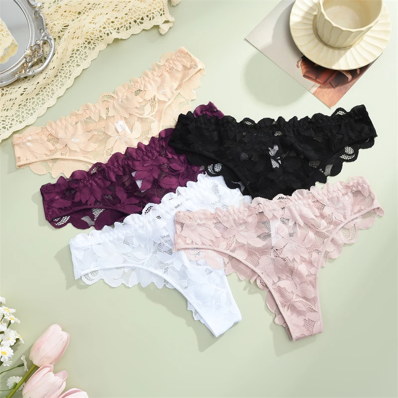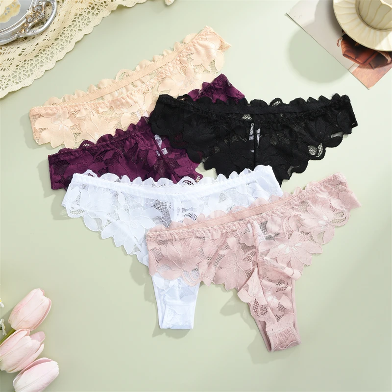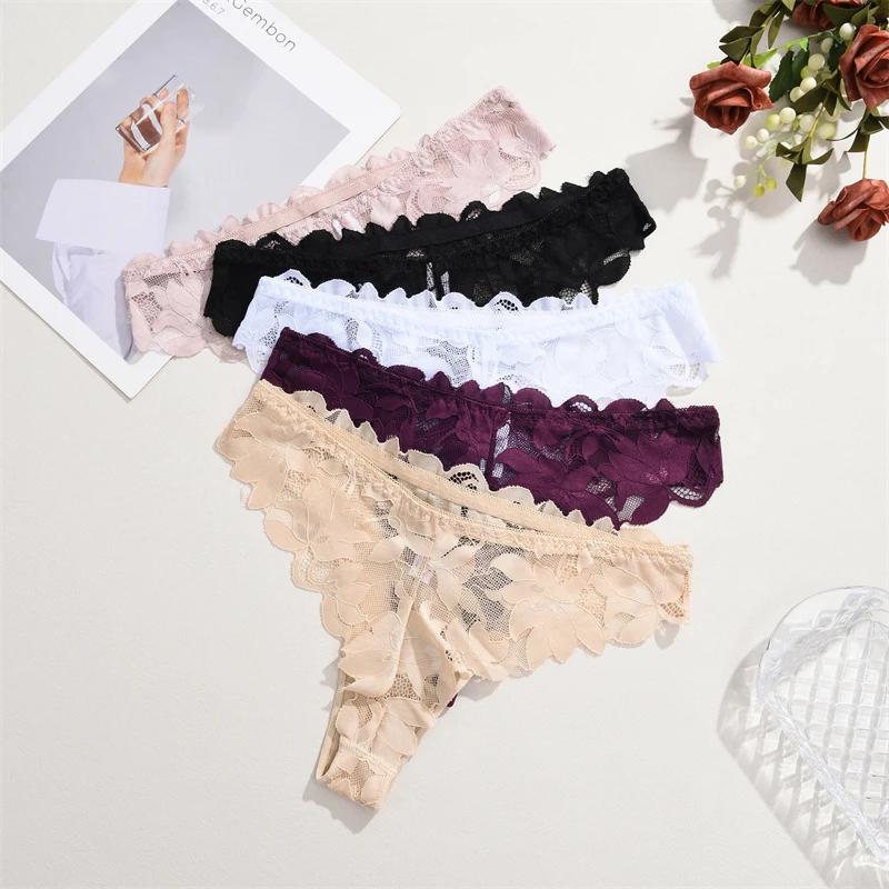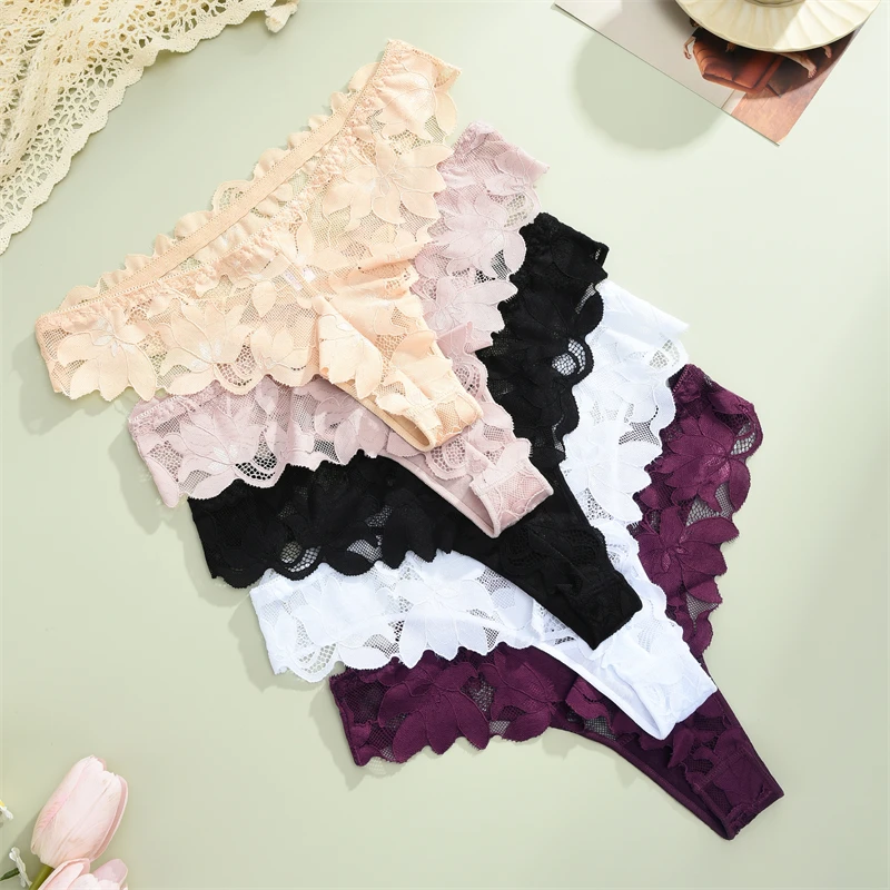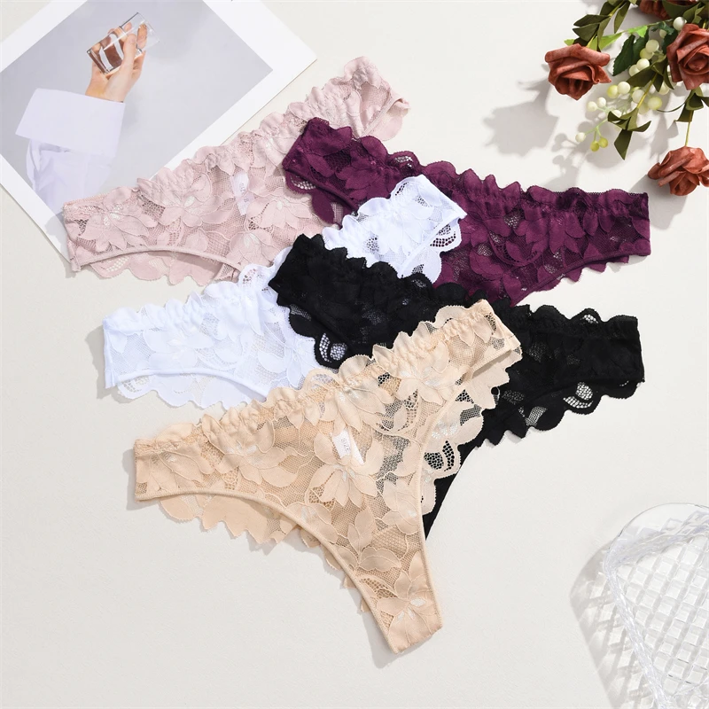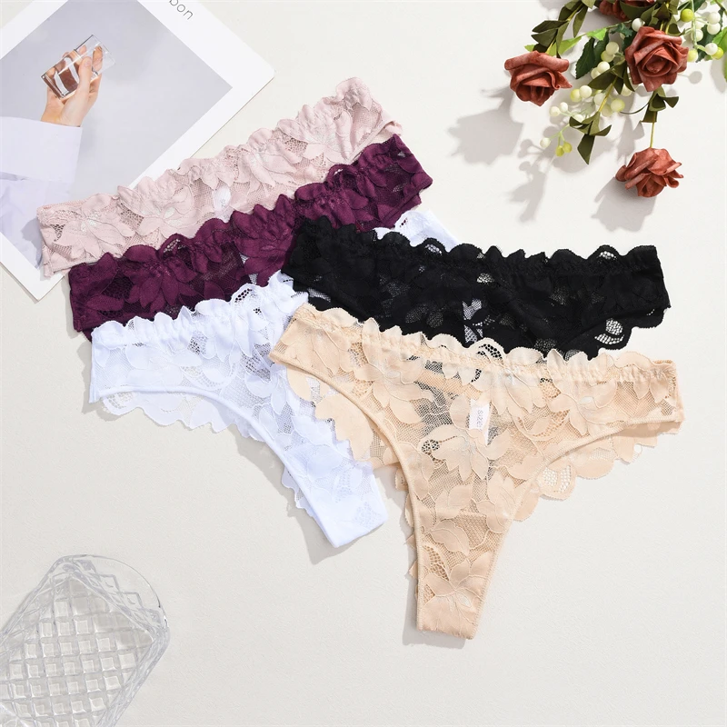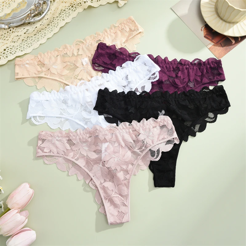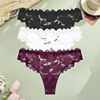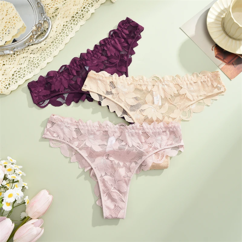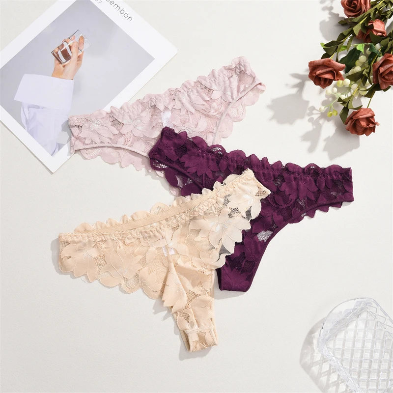 FINETOO 3Pcs Lace Floral Thongs Hollow Out Solid Underwear Women’s Sexy Low Waist Comfortable G-String Hot Girls Erotic Lingerie