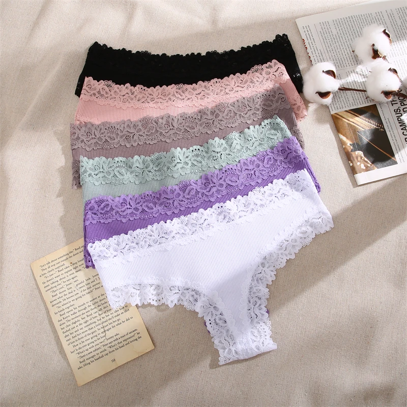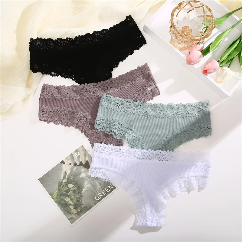 FINETOO 3Pcs Women Cotton Brazilian Panties Sexy Lace Floral Lingerie Female Seamless Low Rise Briefs Ladies Intimates Lingerie