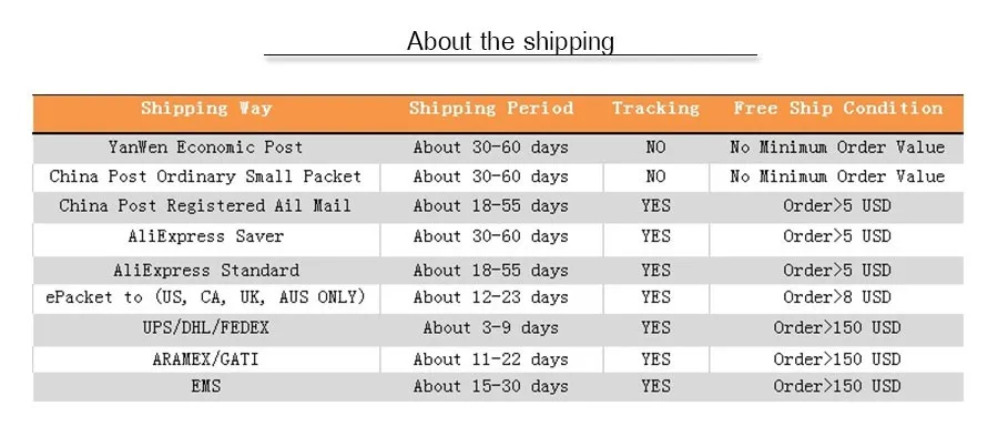 1.We will ship all orders within 48 hours,all goods in our shop are free shipping by post air mail.