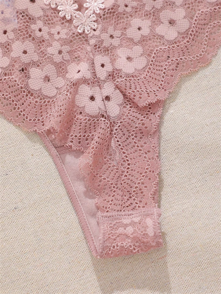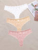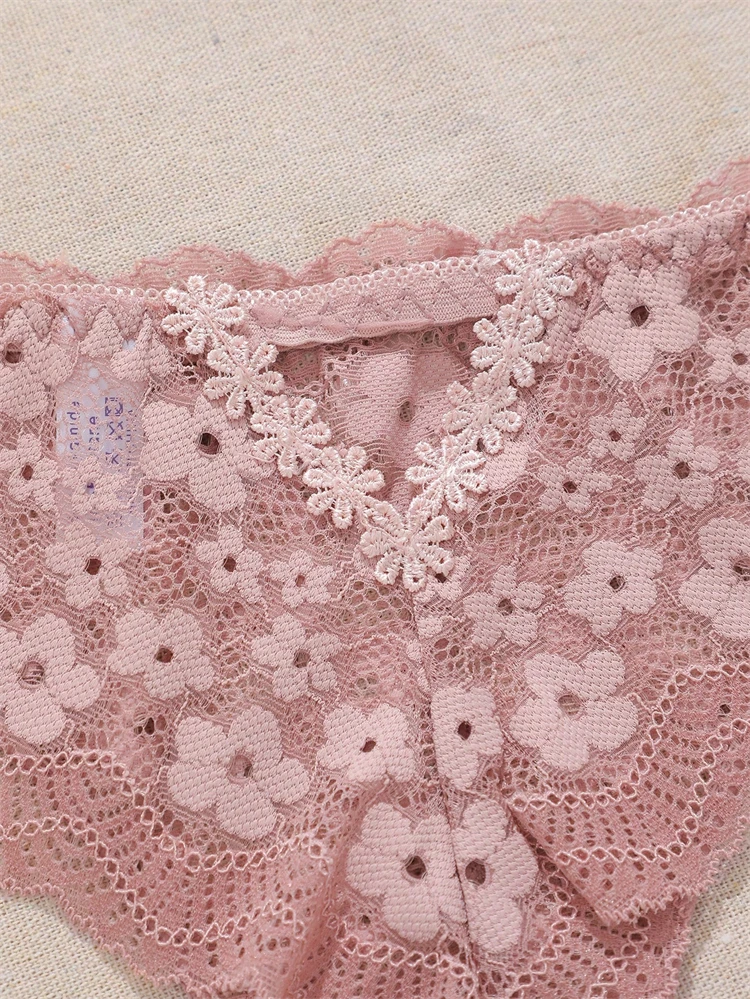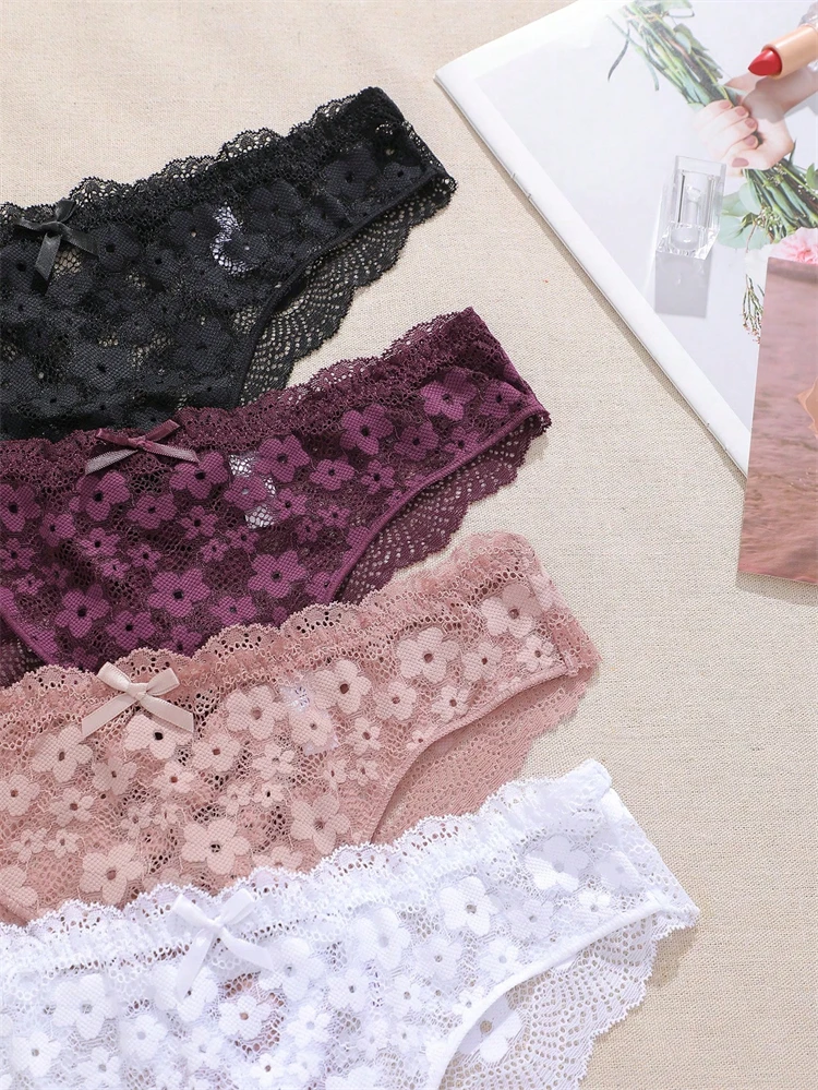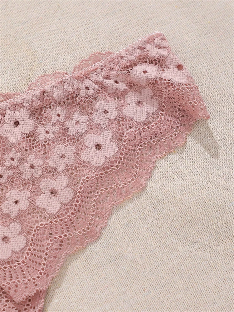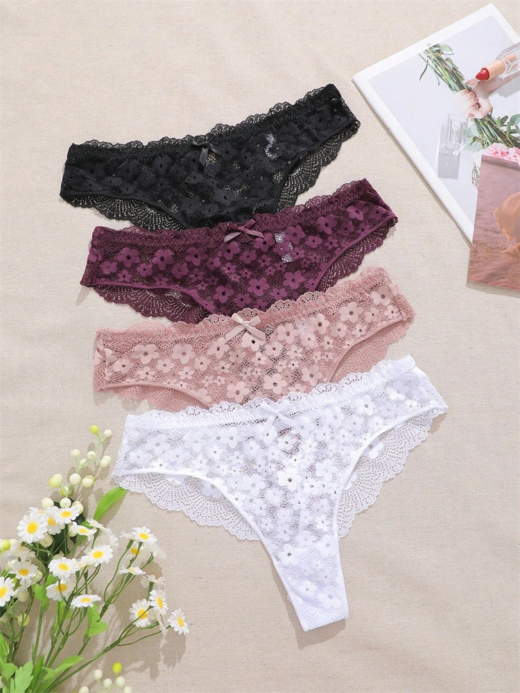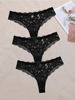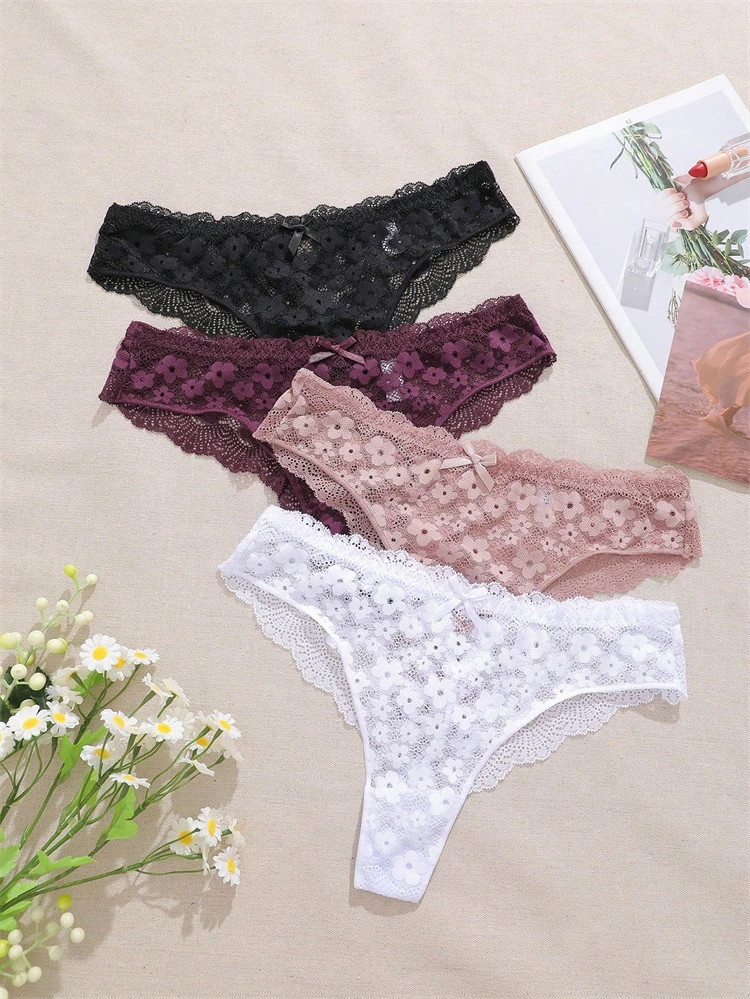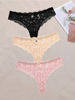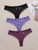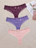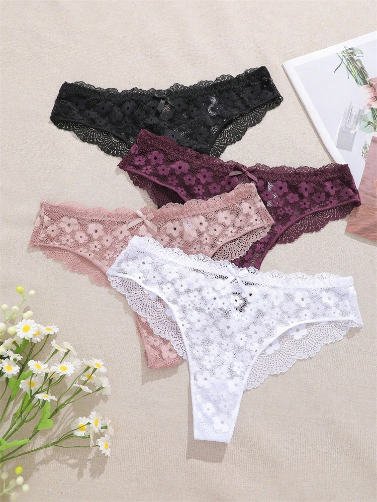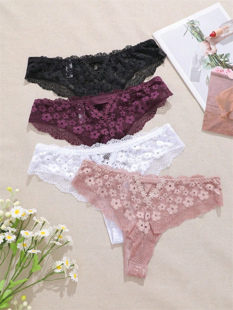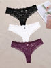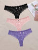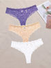 FINETOO 3Pcs Women Sexy Lace Thongs Hollow Out Underwear Floral Print Perspective Panties Girls Low-waist Breathable G-string