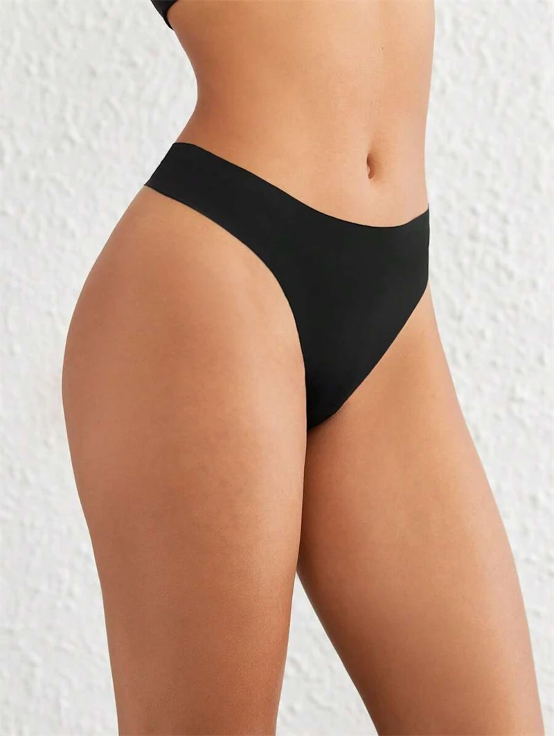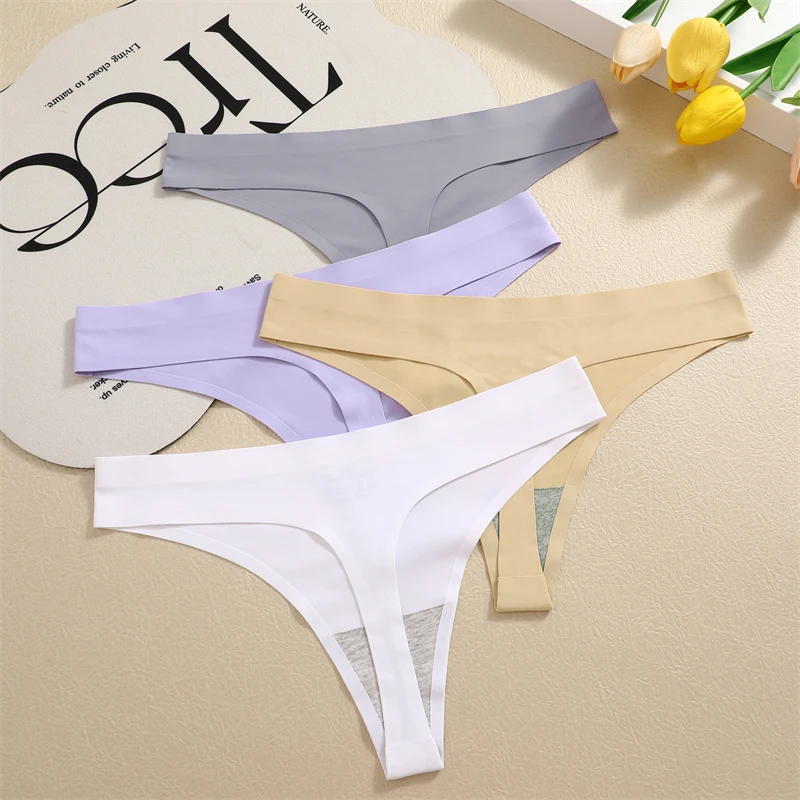 FINETOO 4PCS Silk Satin Seamless Underwear Low Waist Thongs Sexy Solid Color Bikini Underpants Female Stretch Intimates Lingerie