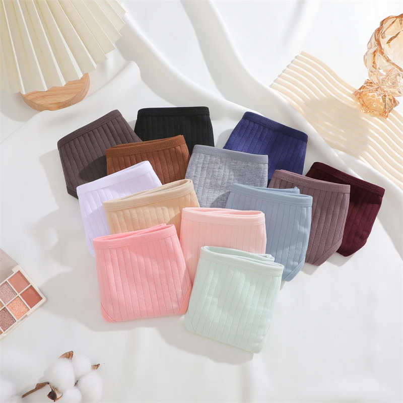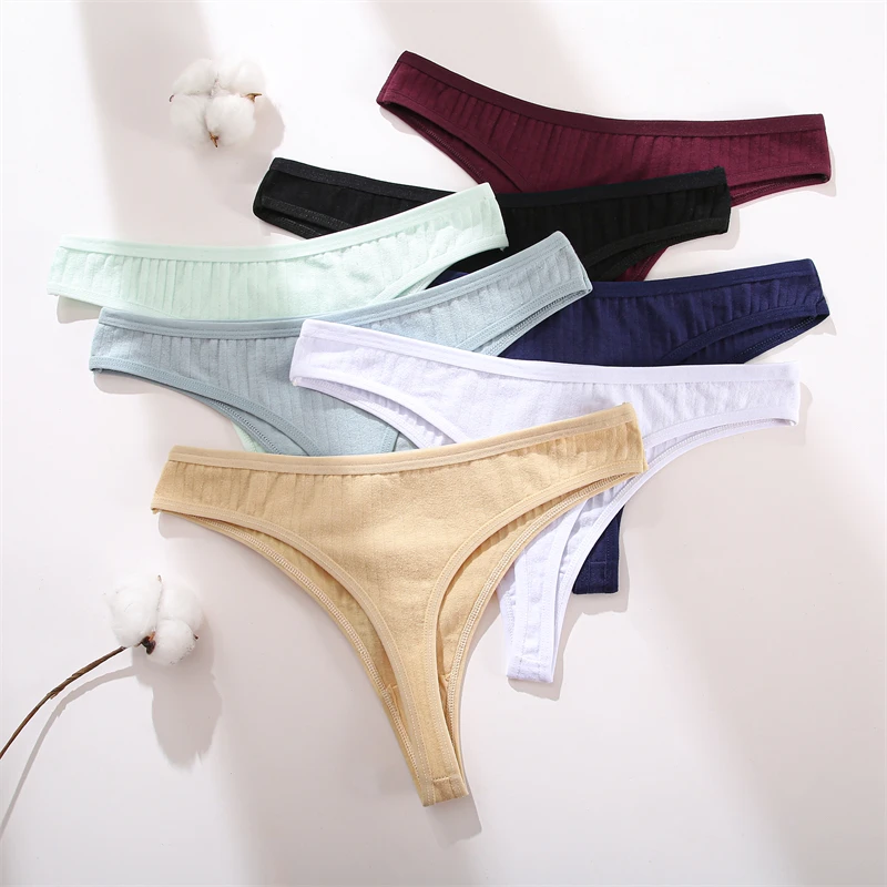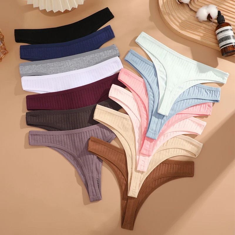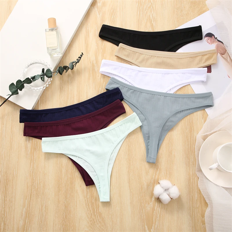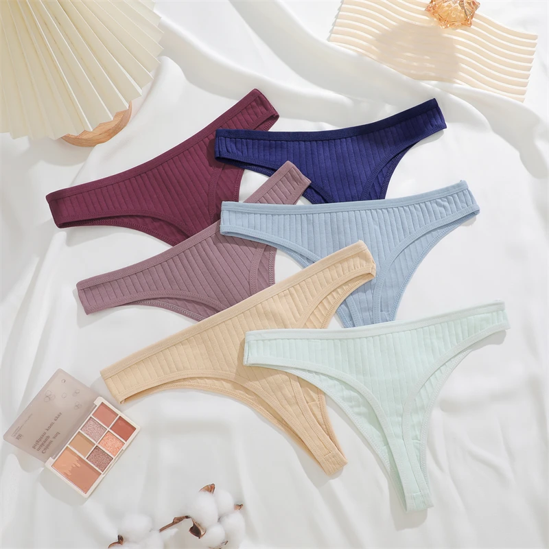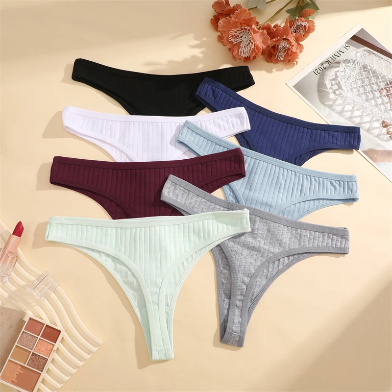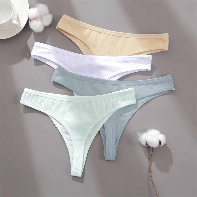 FINETOO 4pcs Women Cotton Striped Underwear Sexy Breathable Thongs Low-Waist Solid G-string Girls Soft Bikini Lingerie Intimates