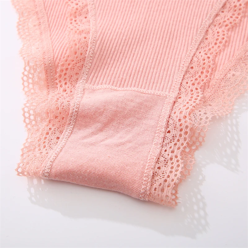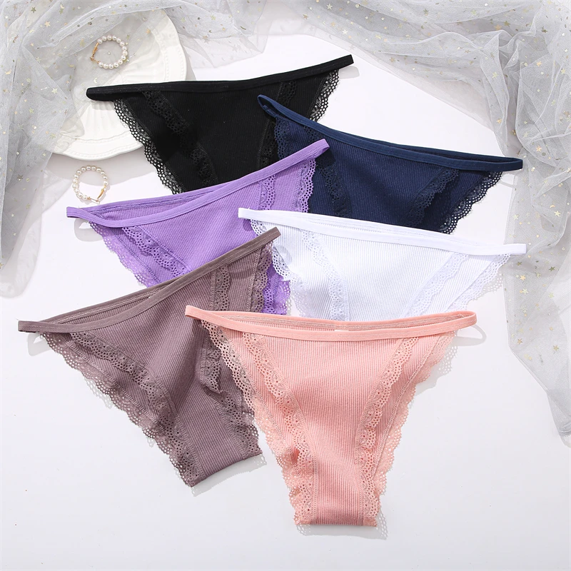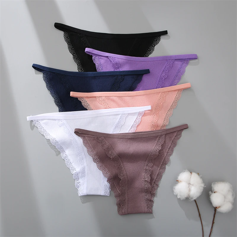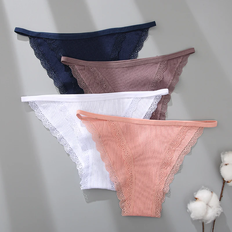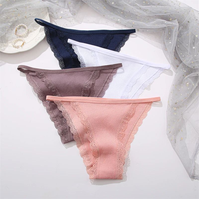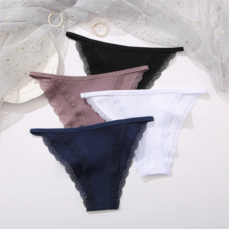 FINETOO 4Pcs Women’s Cotton Panties Lace Floral Underwear Sexy Ribbed Striped Briefs Ladies Solid Low-Waist Lingerie Underpants