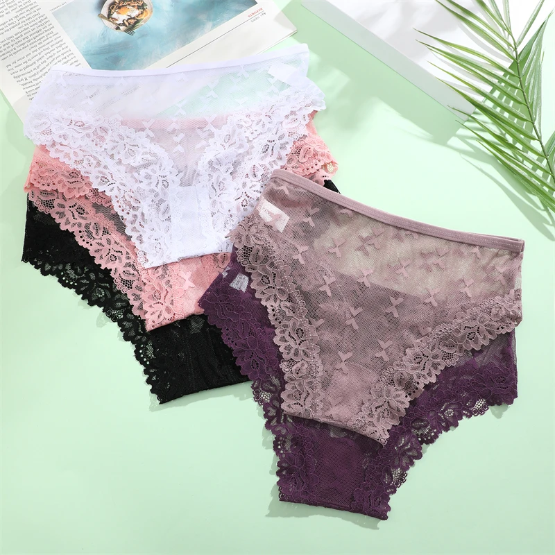 FINETOO 5PCS Women’s Perspective Lace Panties Sexy Hollow Out Underwear Briefs Female Solid Color Lingerie Floral Intimates S-XL
