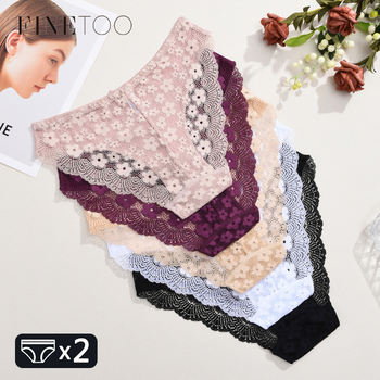 FINETOO 2PCS/Set Sexy Lace Floral Print Briefs Women’s Hollow Out Breathable Panties Low Waist Perspective Comfortable Lingerie