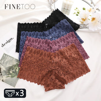 FINETOO 3Pcs Lace Floral Boyshort Women’s Panties Sexy Hollow Out Breathable Underwear Female Low Waist Soild Soft Lingerie S-XL