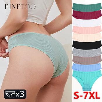 FINETOO 3PCS/SET Women’s Cotton Ribbed Striped Underwear Panties Female Sexy Plus Size High Stretch Briefs Soft Lingerie S-7XL