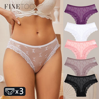 FINETOO 3PCS Women’s Lace Panties Sexy Perspective Underwear Briefs Female Solid Color Hollow Out Lingerie Floral Intimates S-XL