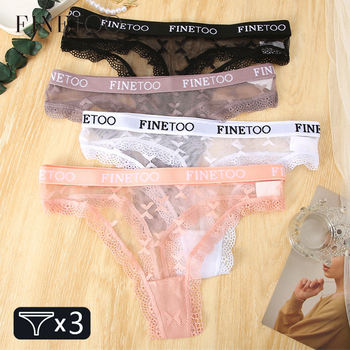 FINETOO 3PCS Women Lace Thong Letter Bikini Underwear Sexy Hollow Out T-Back Panties Female Low-Rise Floral Perspective Lingerie