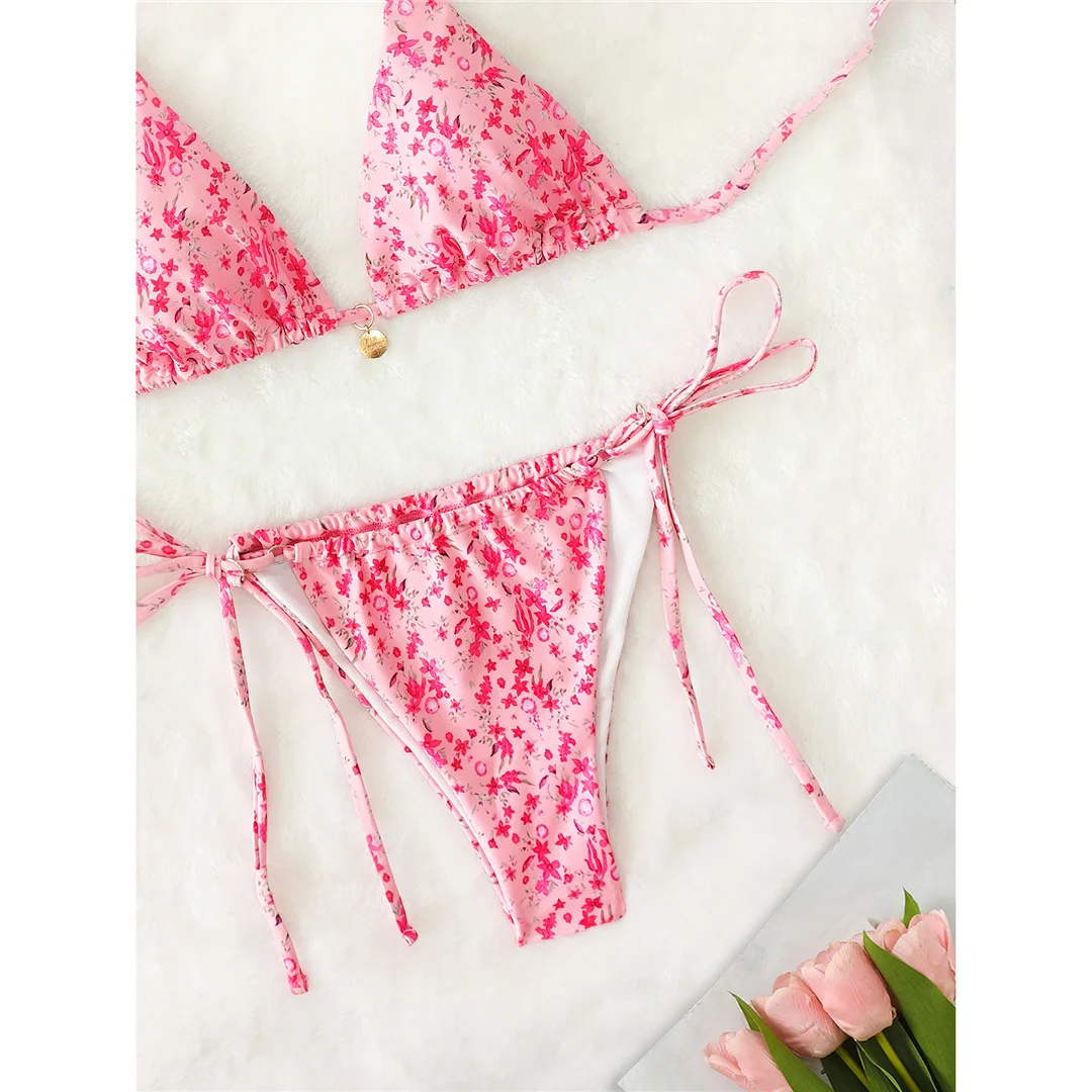 Floral Flower Printed String Tie Side Bikini Female Swimsuit Women Swimwear Two-pieces Bikini set Bather Bathing Suit Swim V6437