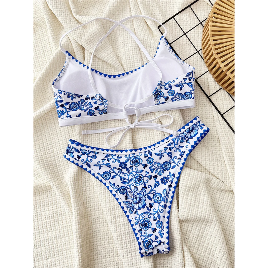 Floral Printed Cross Back Bikini Women Swimwear Female Swimsuit Two-pieces Bikini set Brazilian Bather Bathing Suit Swim V6705B