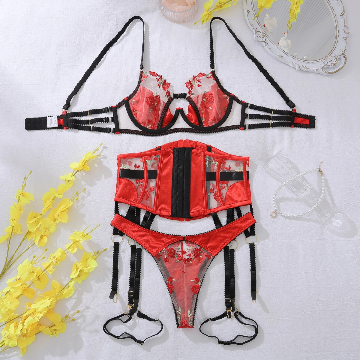 Flower bud decoration perspective splicing lingerie red rose embroidery belly closure sexy lingerie split four piece set