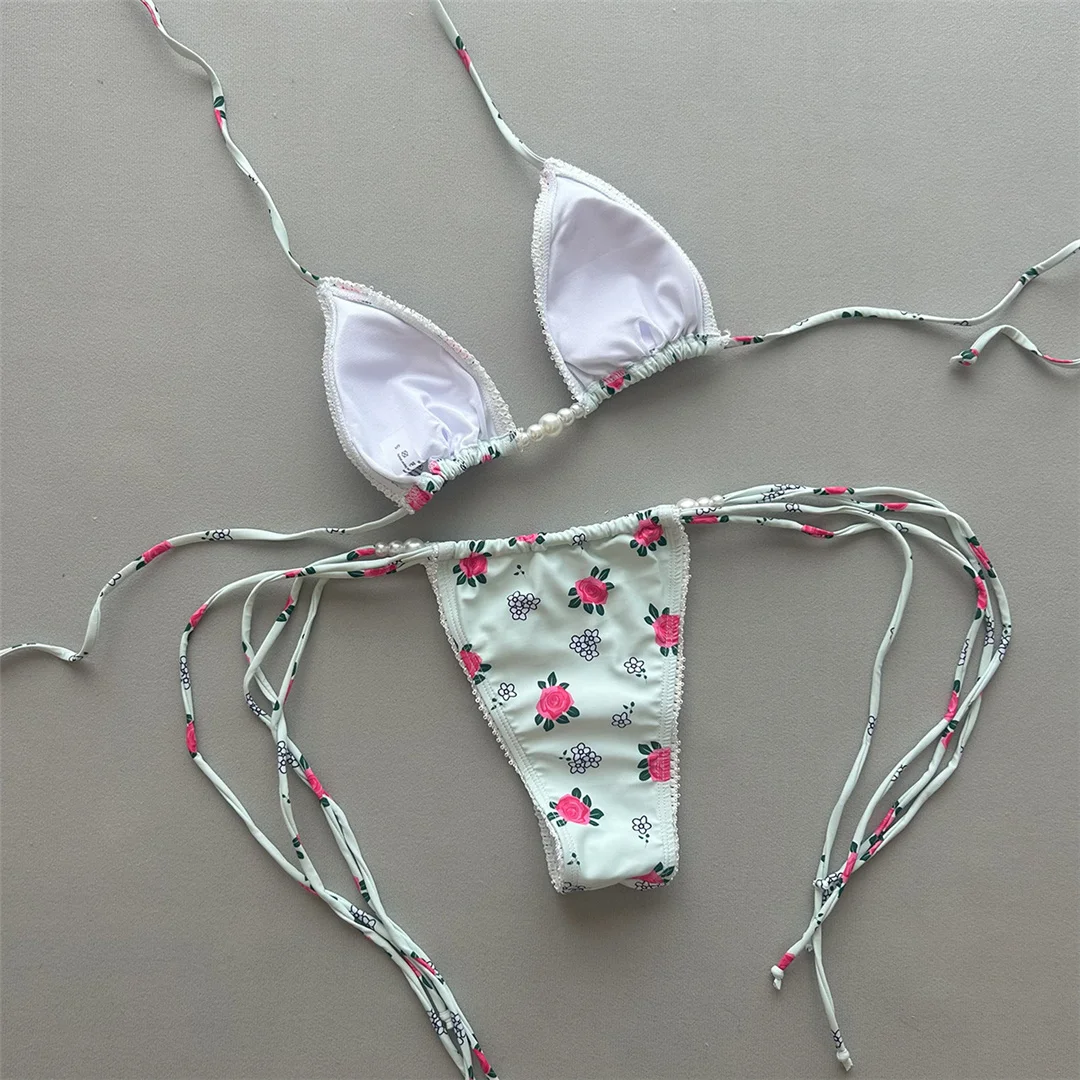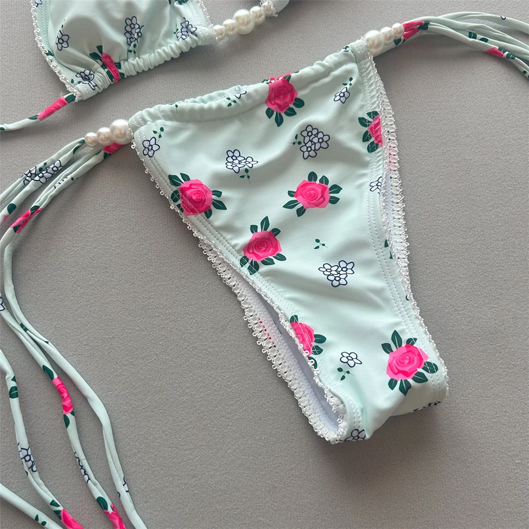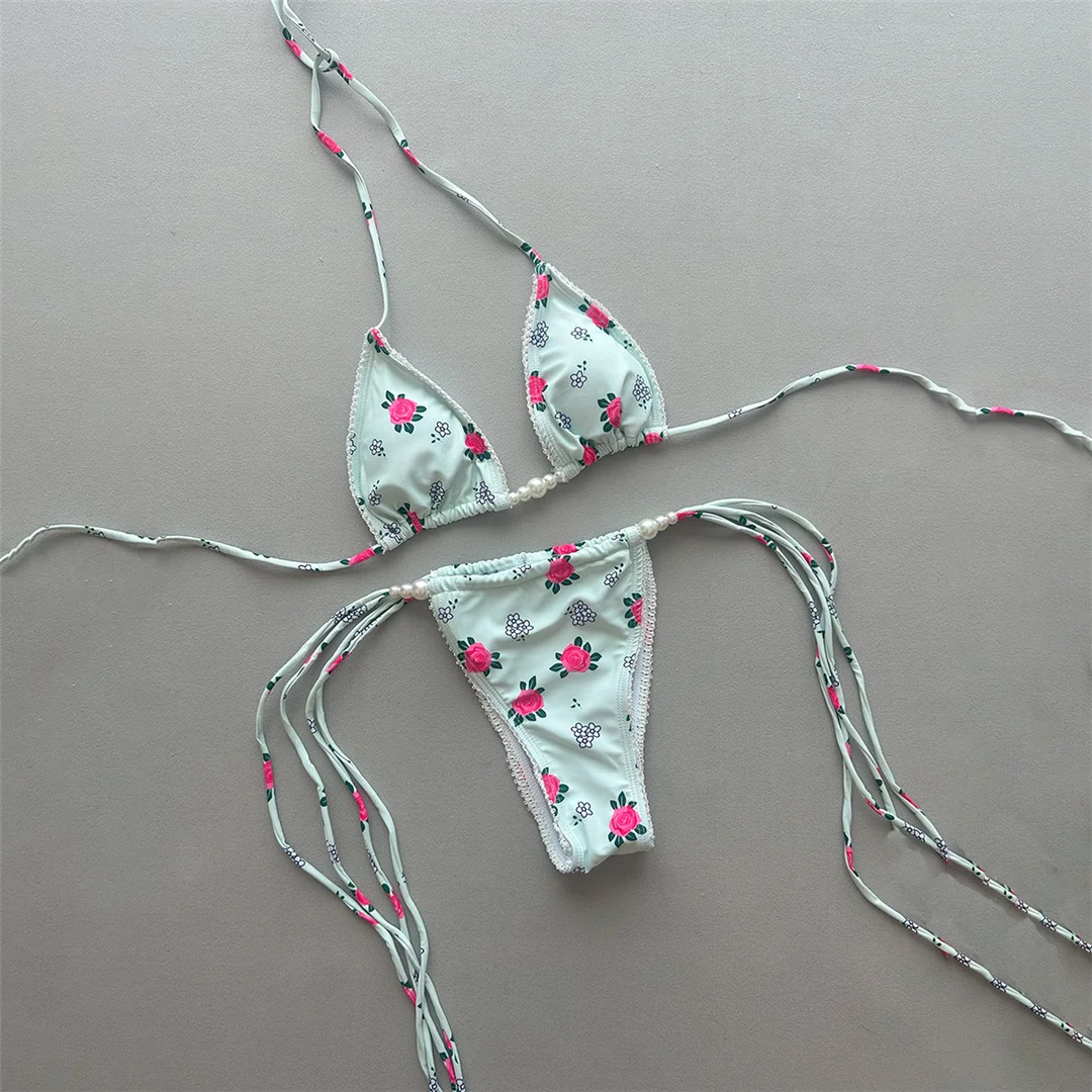 Flowers Printed Halter Bikini Female Swimsuit Women Swimwear Two-pieces Bikini set High Cut Leg Bather Bathing Suit Swim V7395