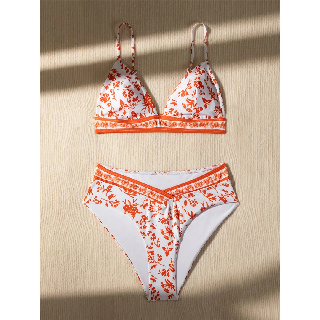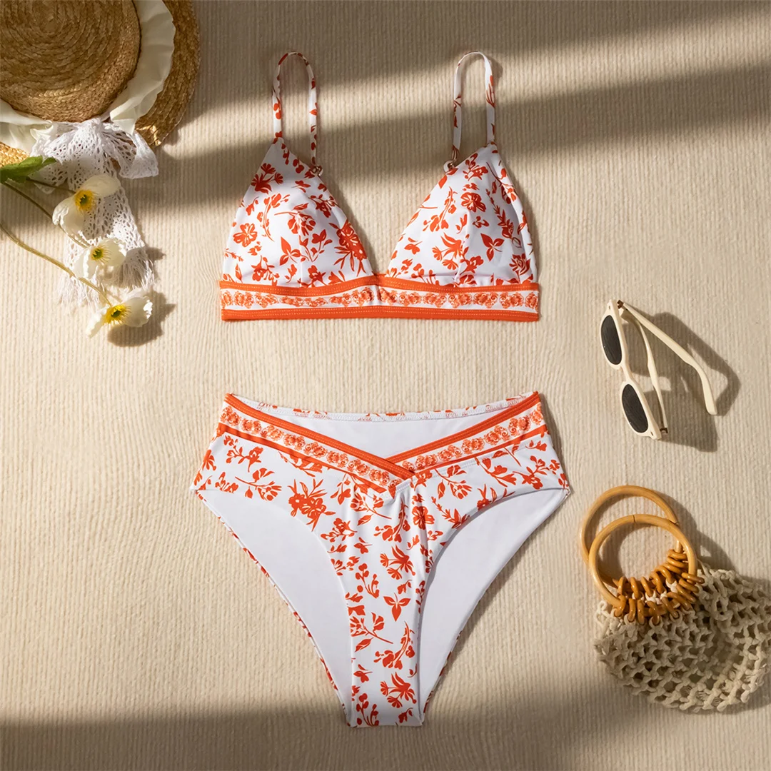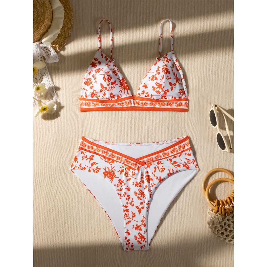 Flowers Printed High Cut Mid Waist Bikini Female Swimsuit Women Swimwear Two-pieces Bikini set Bather Bathing Suit Swim V5338