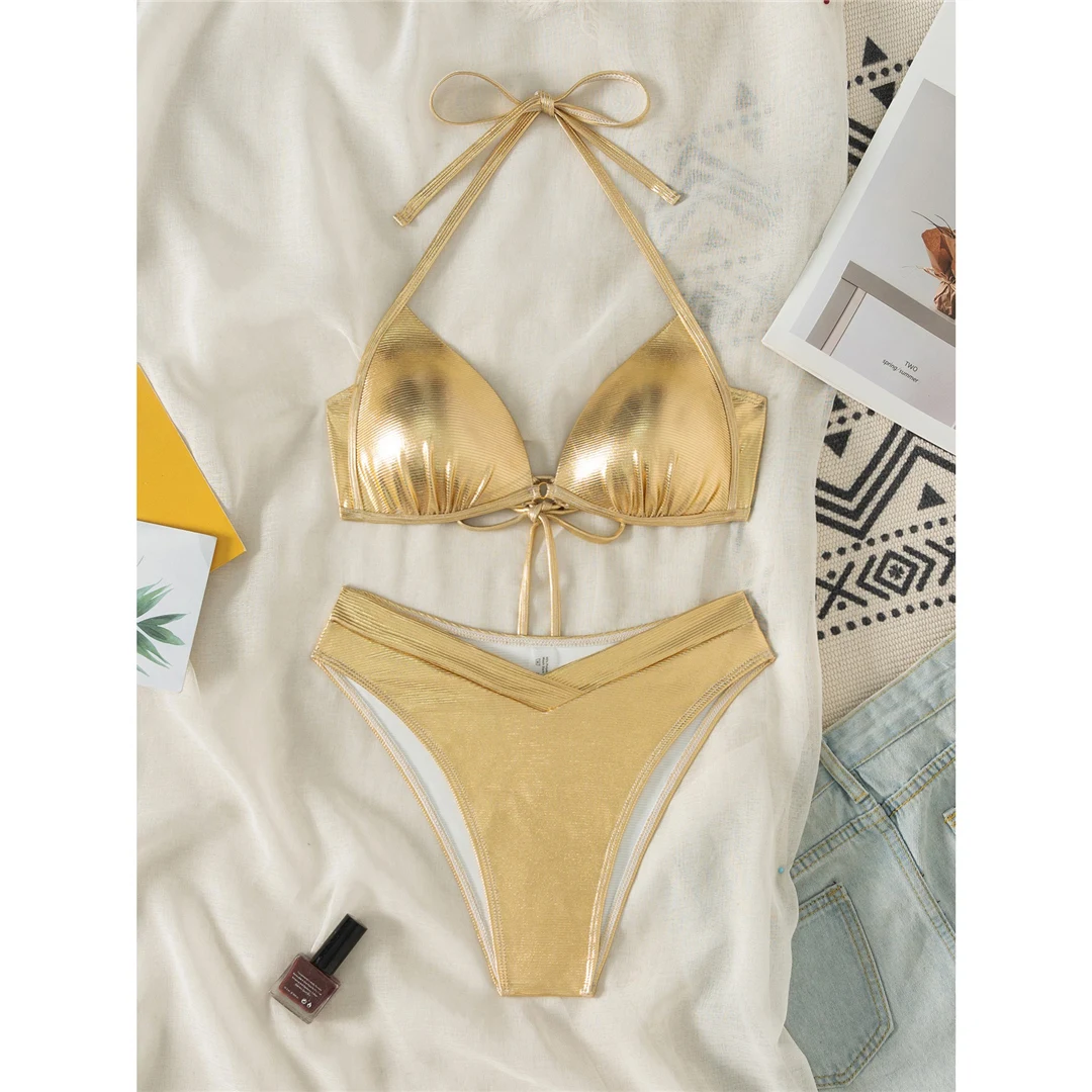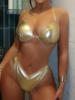 Golden Sexy PU Faux Leather High Cut Bikini Women Swimwear Female Swimsuit Two-pieces Bikini set Bather Bathing Suit Swim V6409