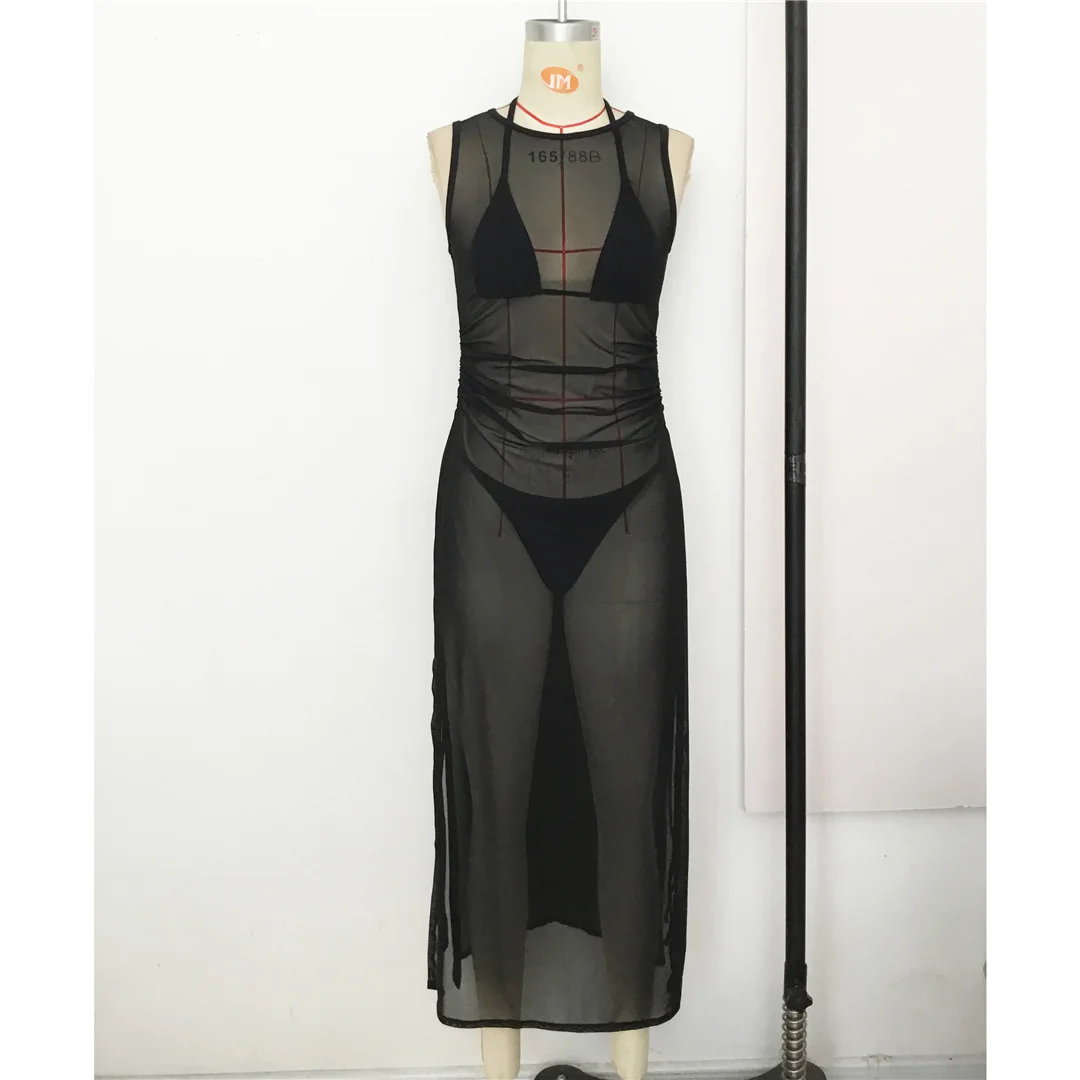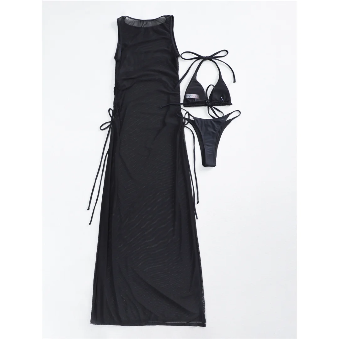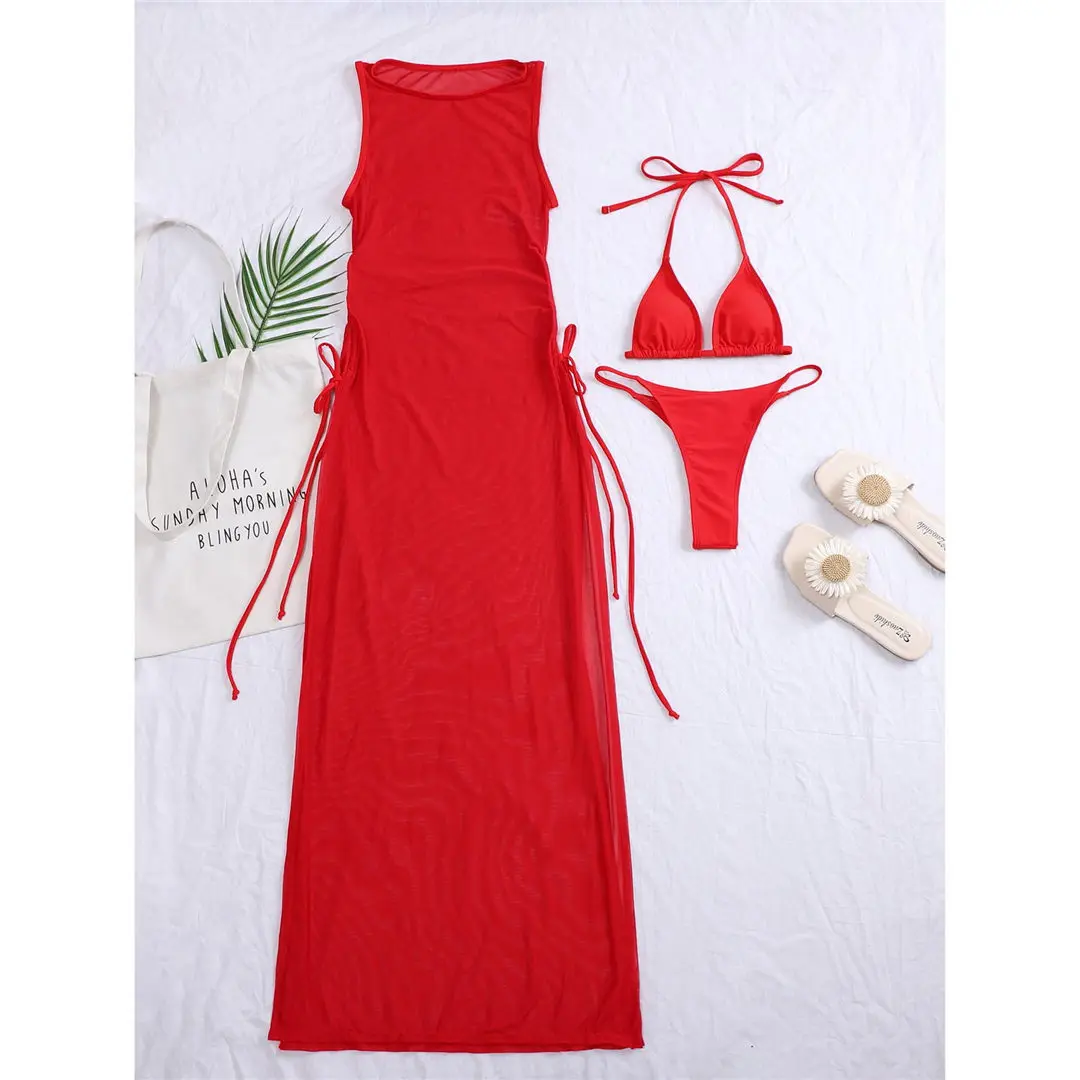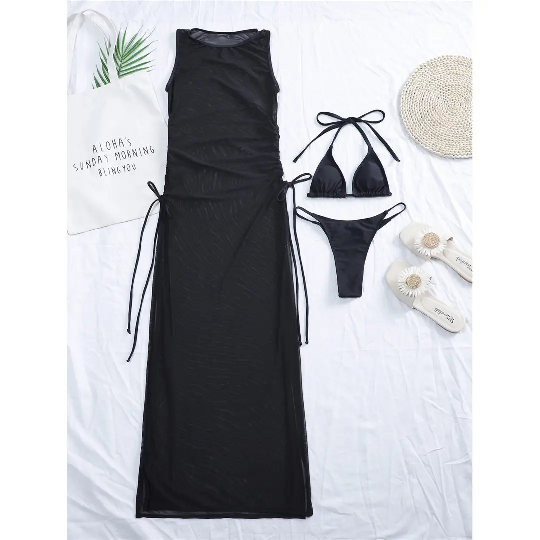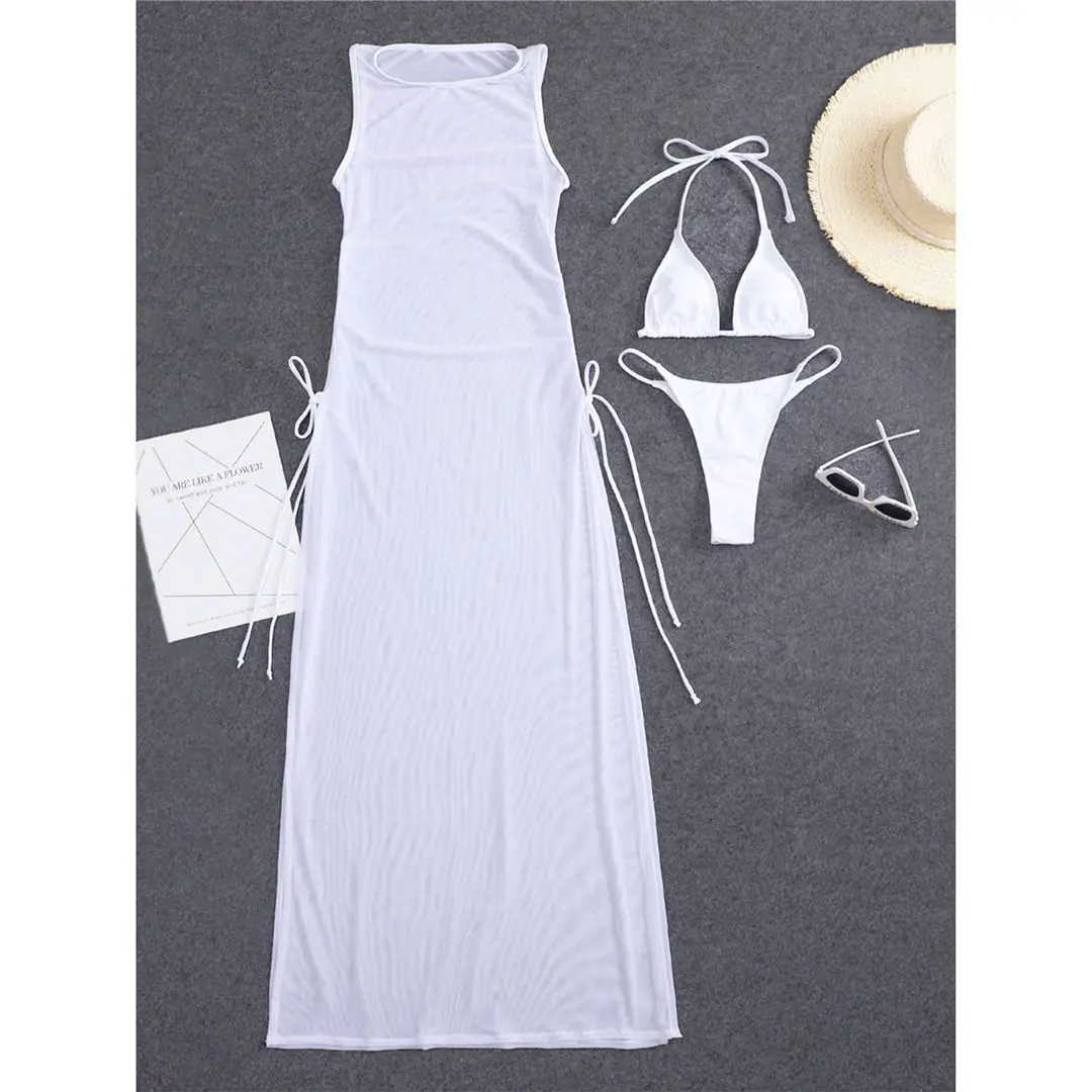 Halter Bikini Female Swimsuit Women Swimwear Three-pieces Bikini set With Dress High Leg Cut Bather Bathing Suit Swim Lady V2875