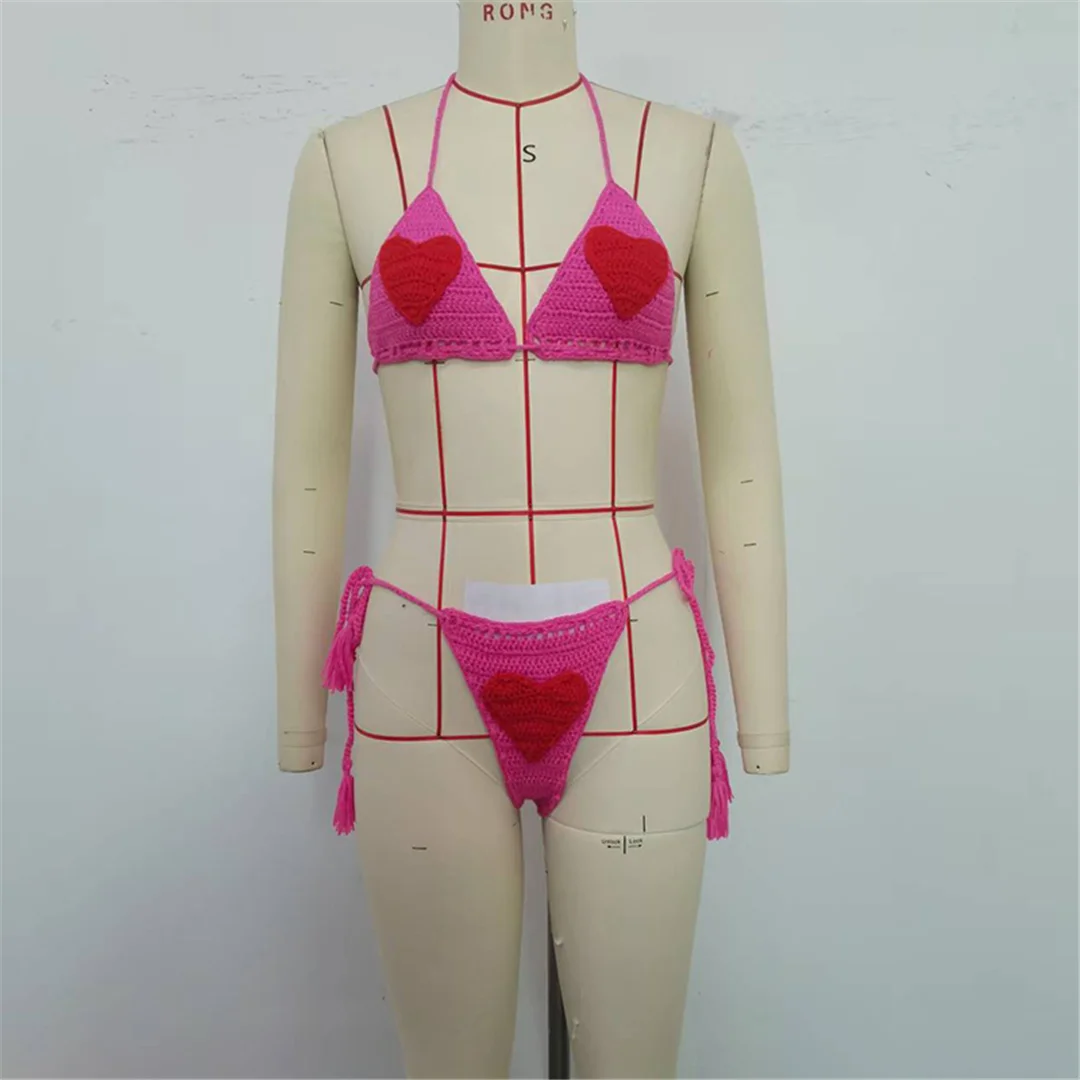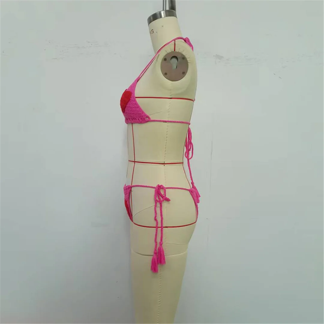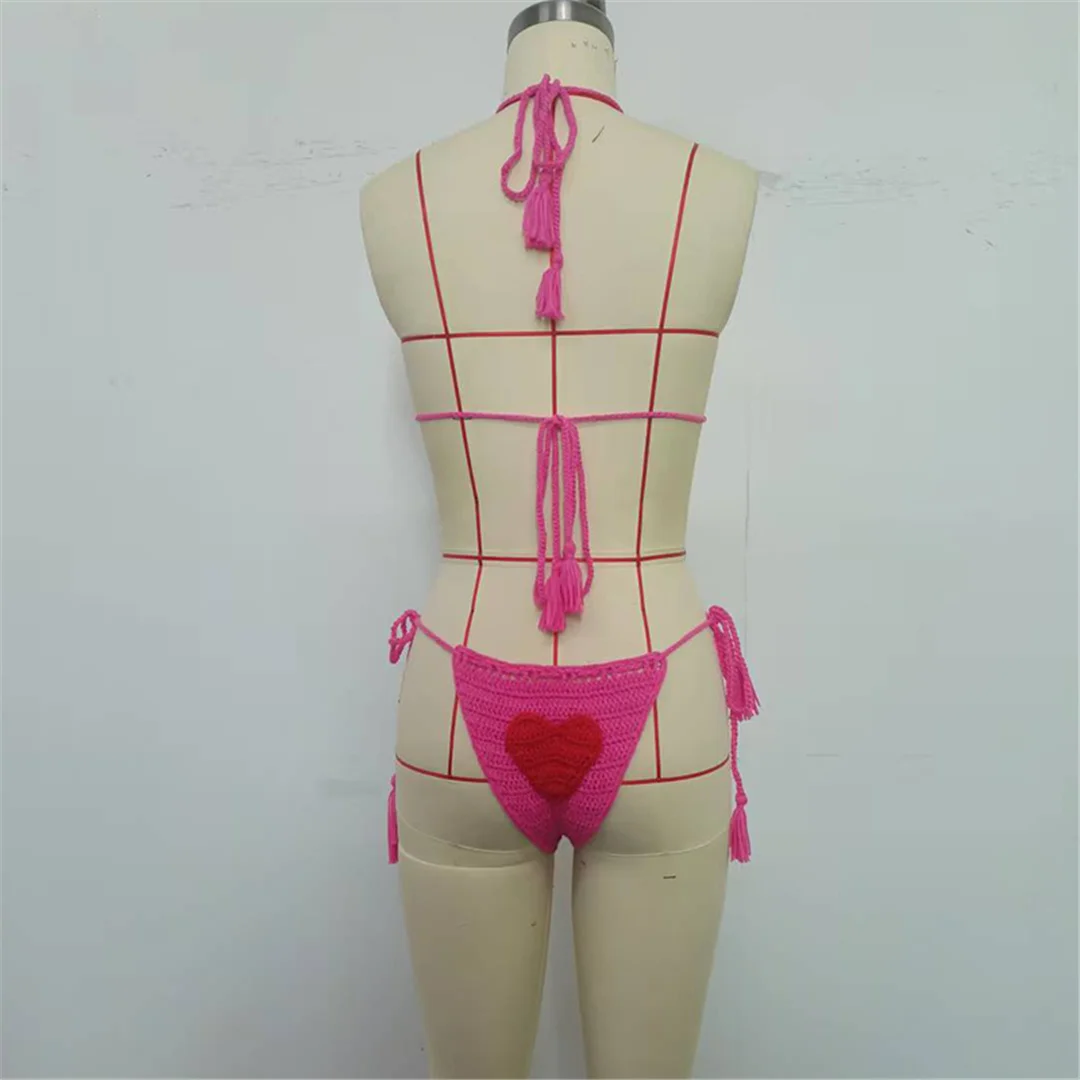 Halter Crochet Knitted High Cut Leg Bikini Female Swimsuit Women Swimwear Two-pieces Bikini set Bather Bathing Suit Swim V6715