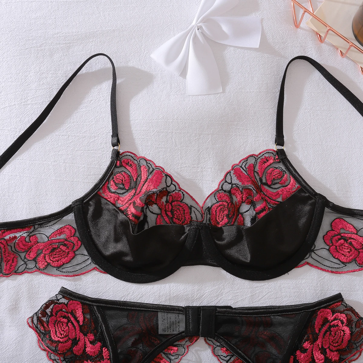 Heavy Crafted Rose Embroidered Mesh Perspective Underwear Color Match Splicing Mysterious Sexy Shaped Underwear Three Piece Set