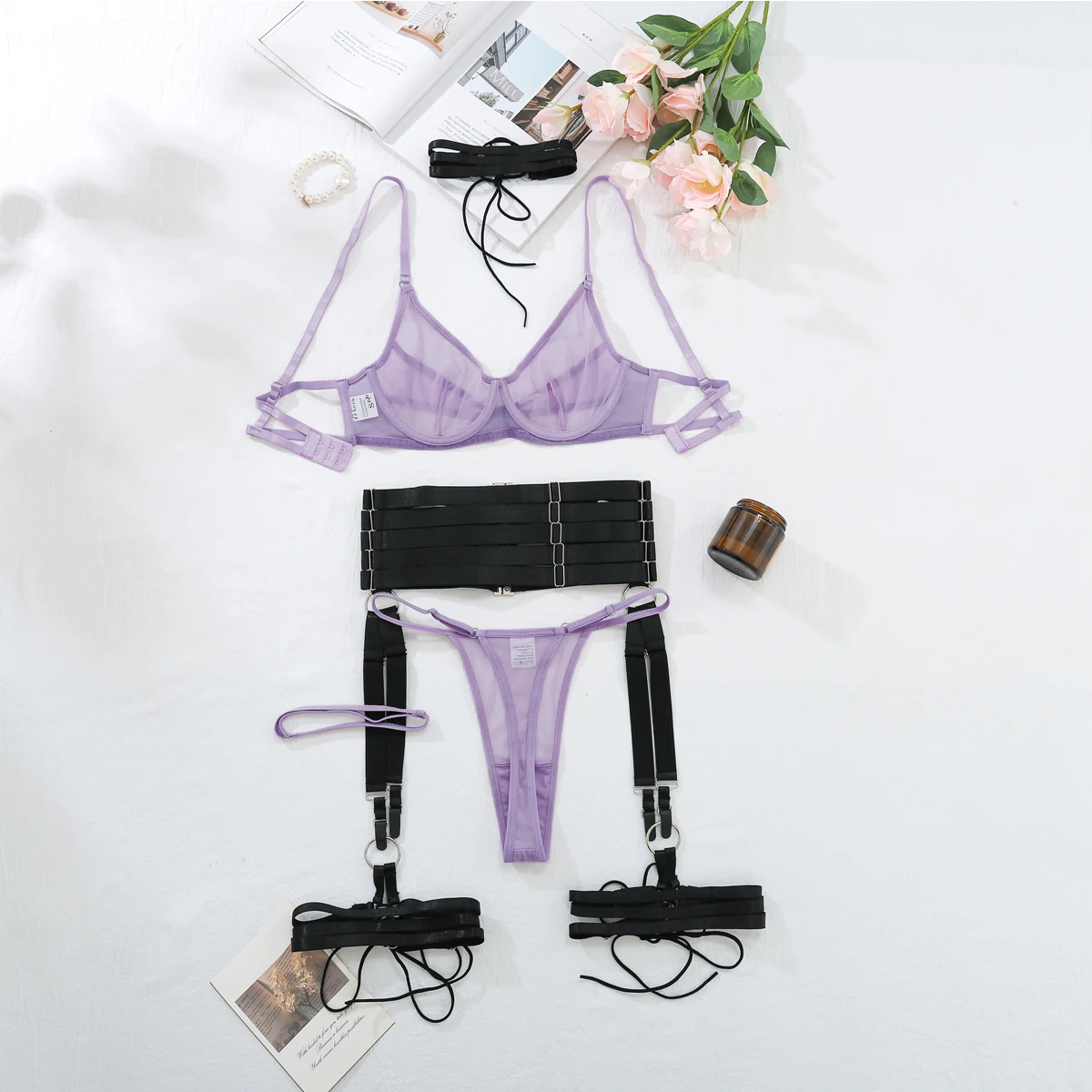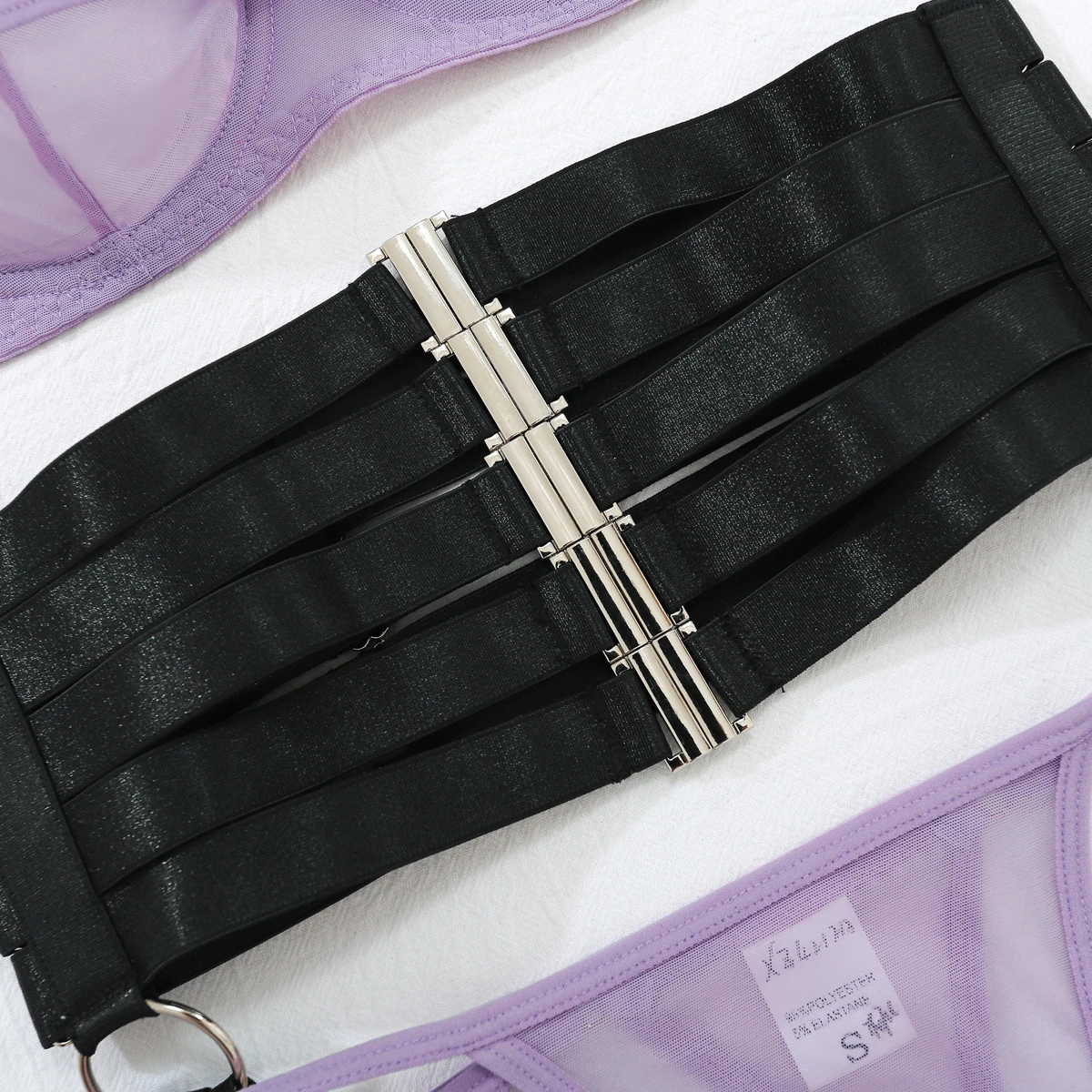 Hot Women’s Sexy Lingerie Mesh See-through Fashion Clash Of Colours Breathable Gathered Bra Garter Belt Erotic Three-piece Set