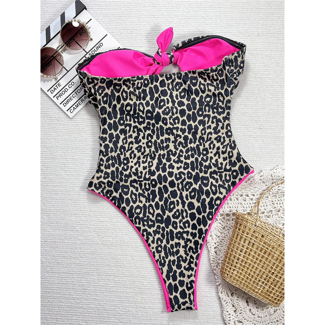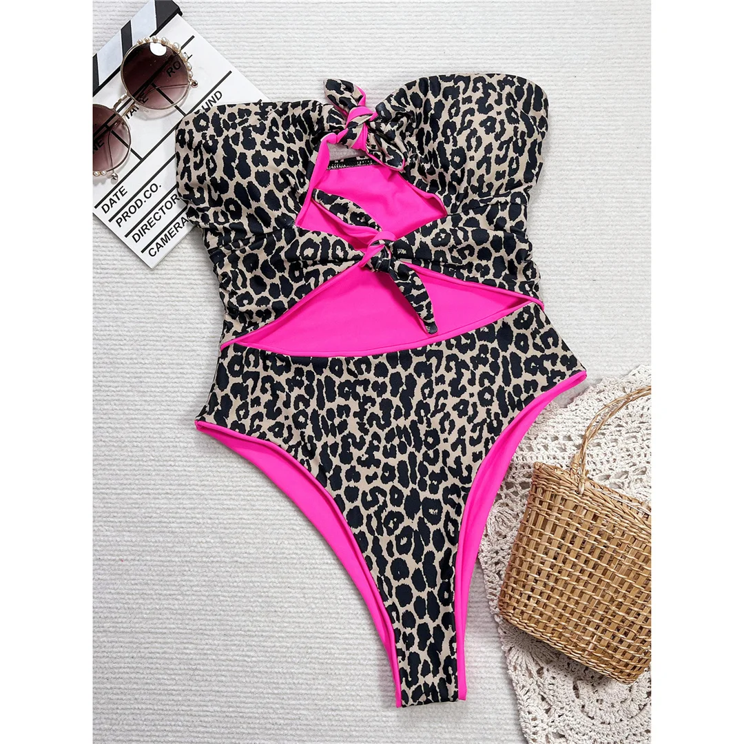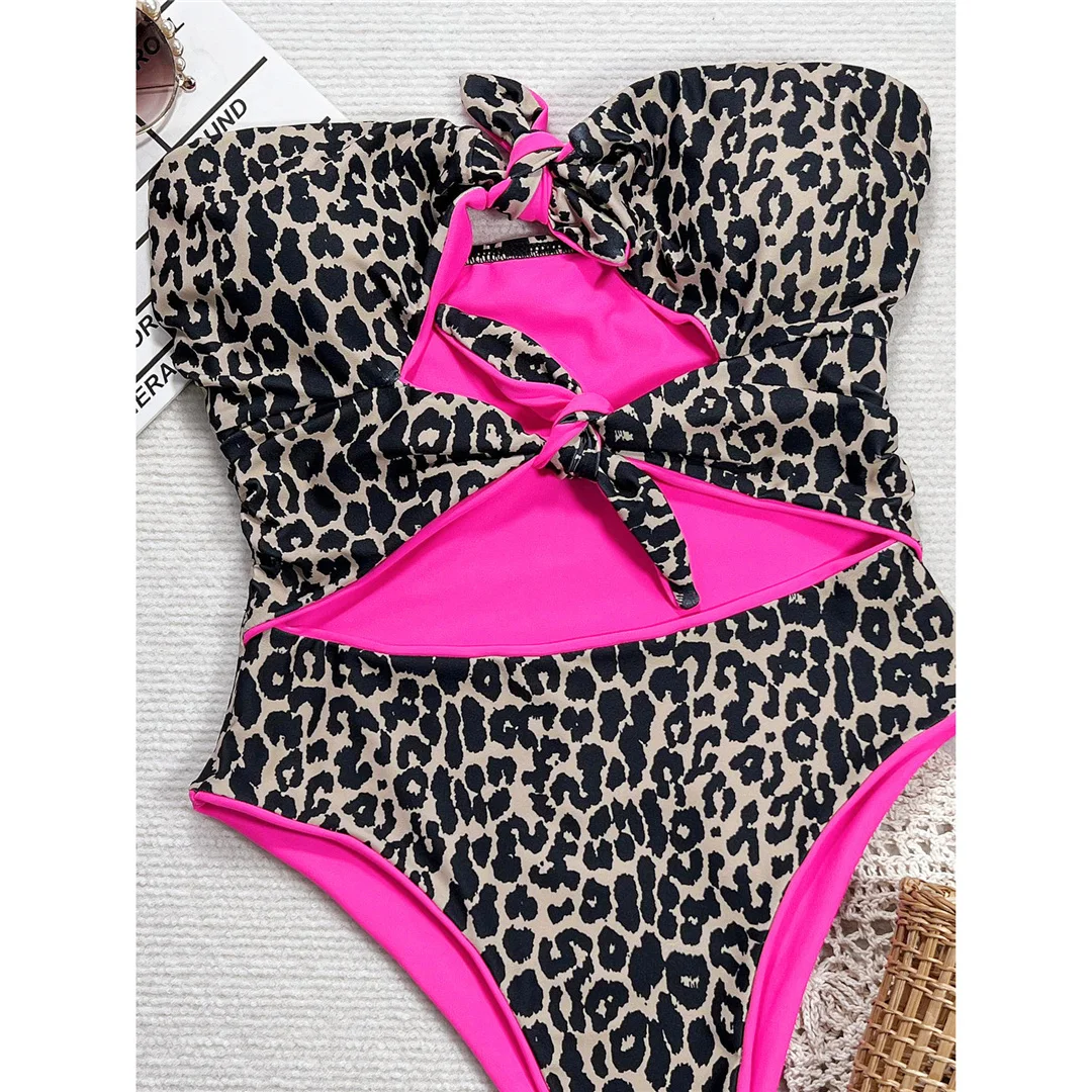 Leopard Bandeau Cut Out Knotted One Piece Swimsuit Women Swimwear Female High Leg Cut Monokini Bather Bathing Suit Swim V7151