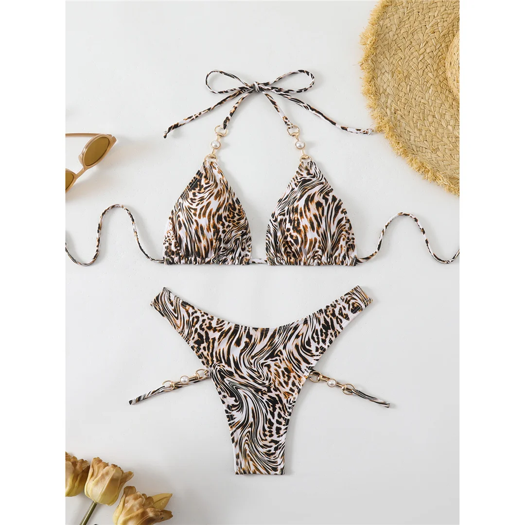 Leopard Halter High Cut Leg Jewelled Bikini Women Swimwear Female Swimsuit Two-pieces Bikini set Bather Bathing Suit Swim V6499