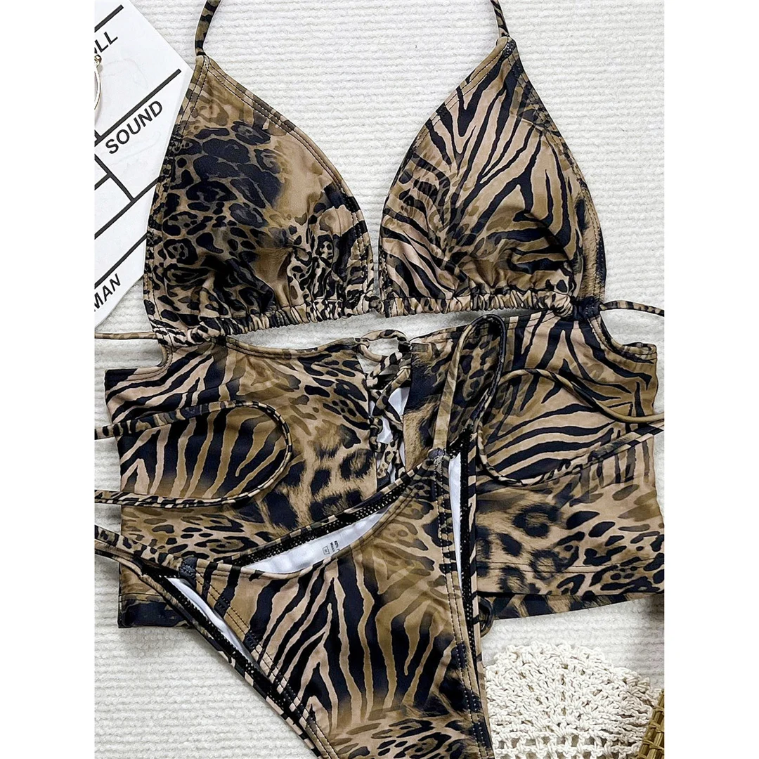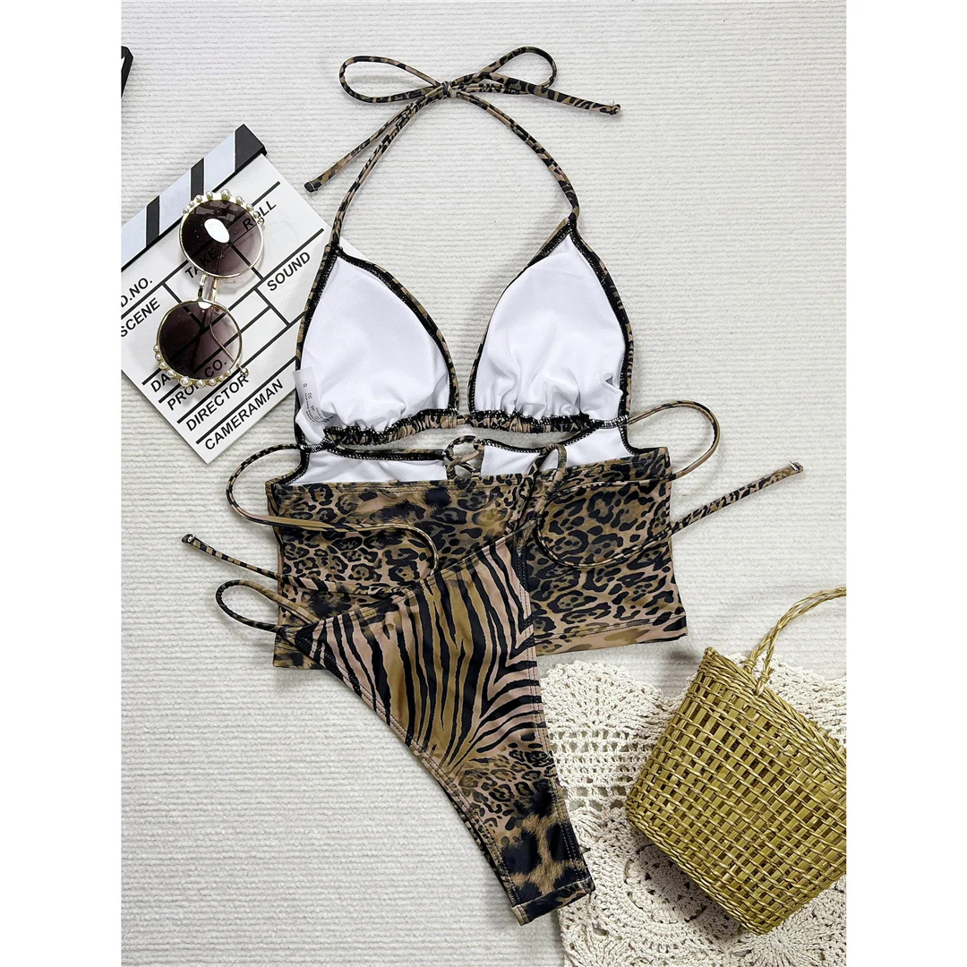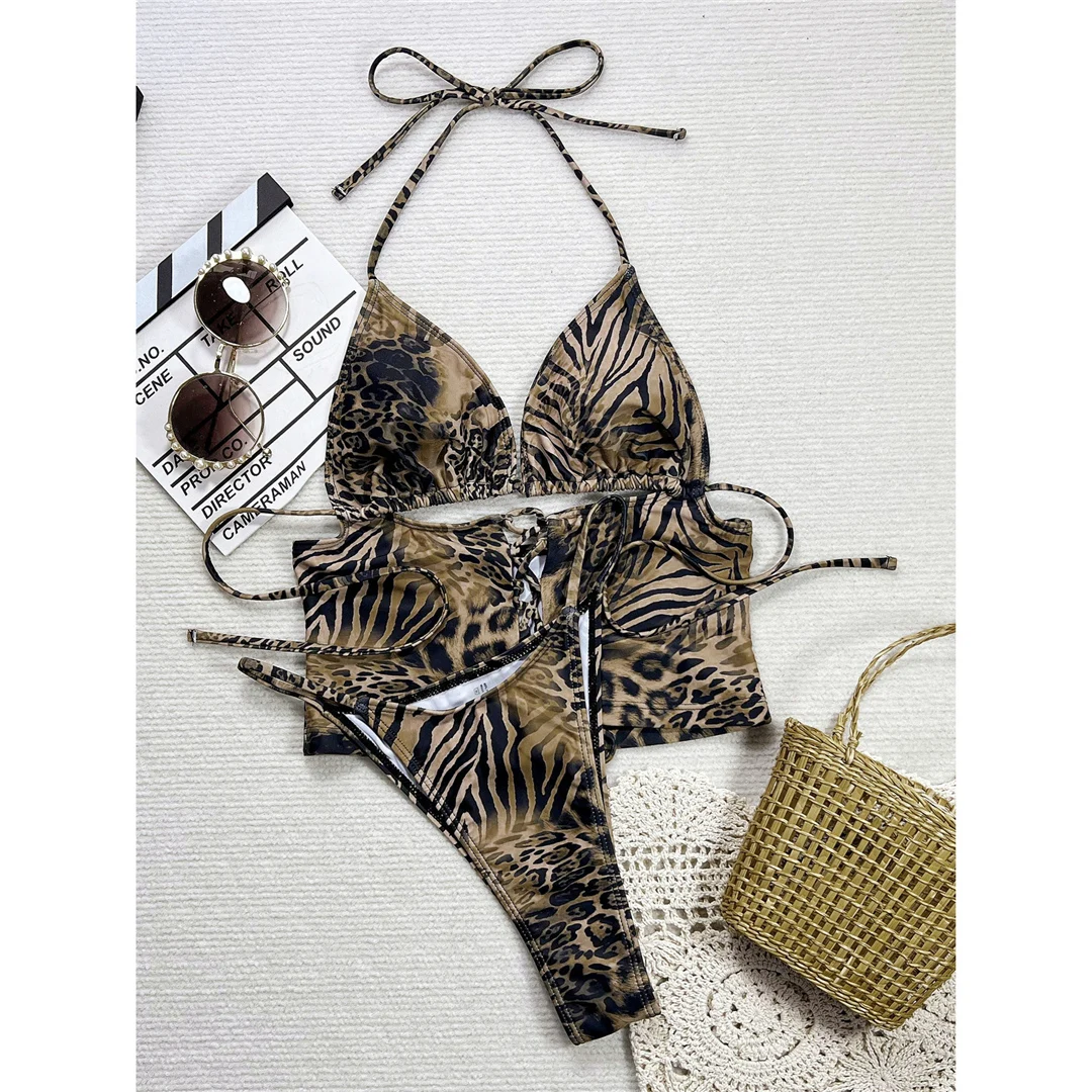 Leopard Halter Lace Up High Leg Cut Bikini Women Swimwear Female Swimsuit Two-pieces Bikini set Bather Bathing Suit Swim V6471