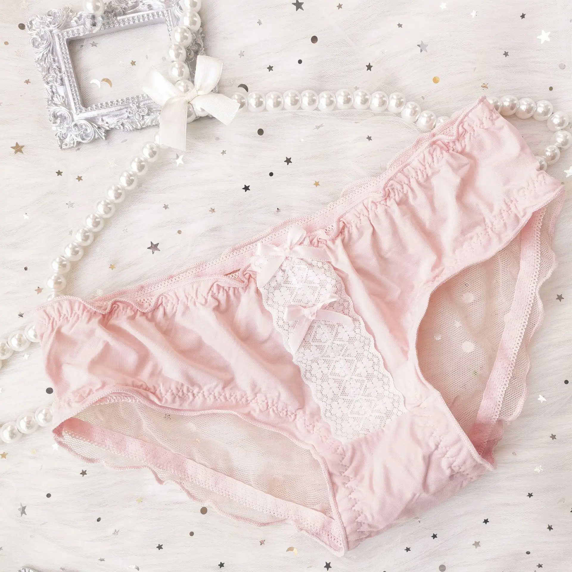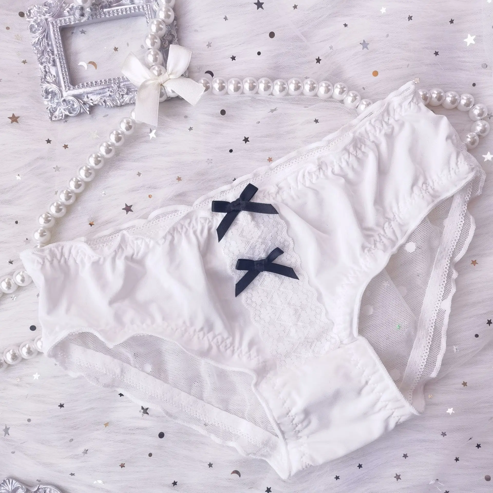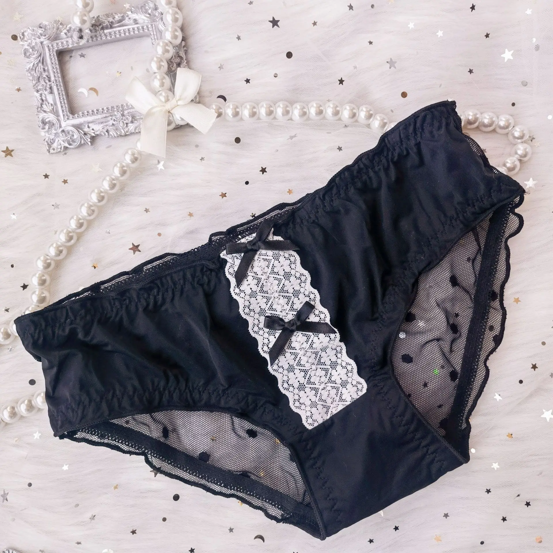 Women’s Comfortable Ice Silk Underpants Lolita Sexy Double Bow Girls Panties Transparent Wave Point Lace Female Briefs