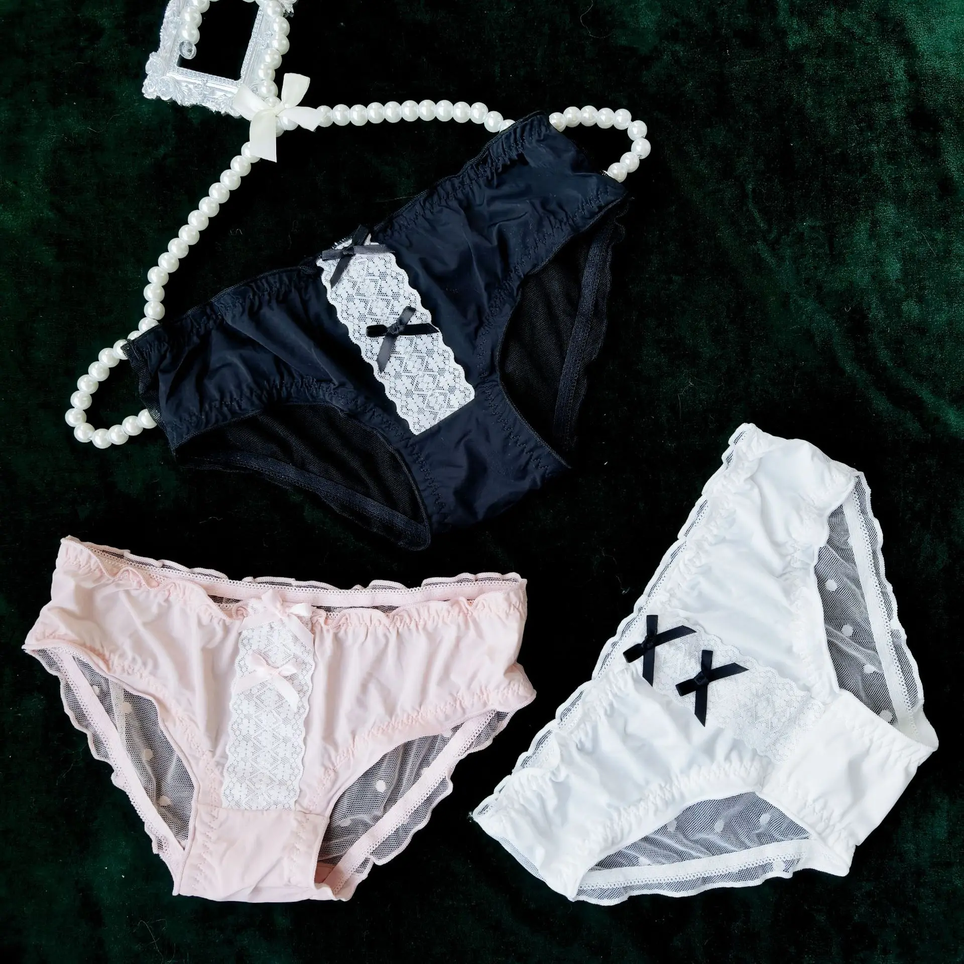 Lolita Sexy Double Bow Girls Panties Comfortable Ice Silk Women’s Underpants Transparent Wave Point Lace Edge Female Briefs