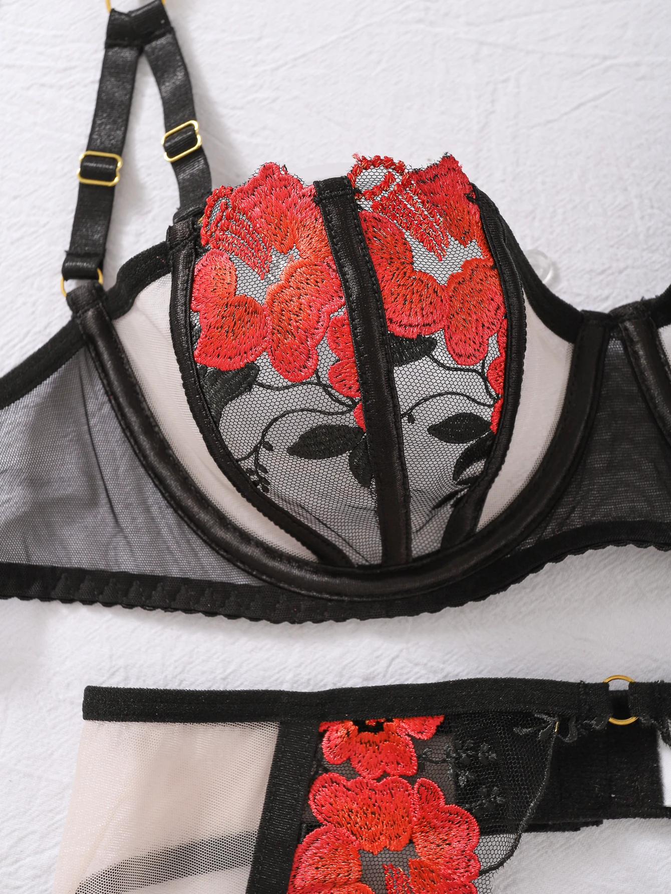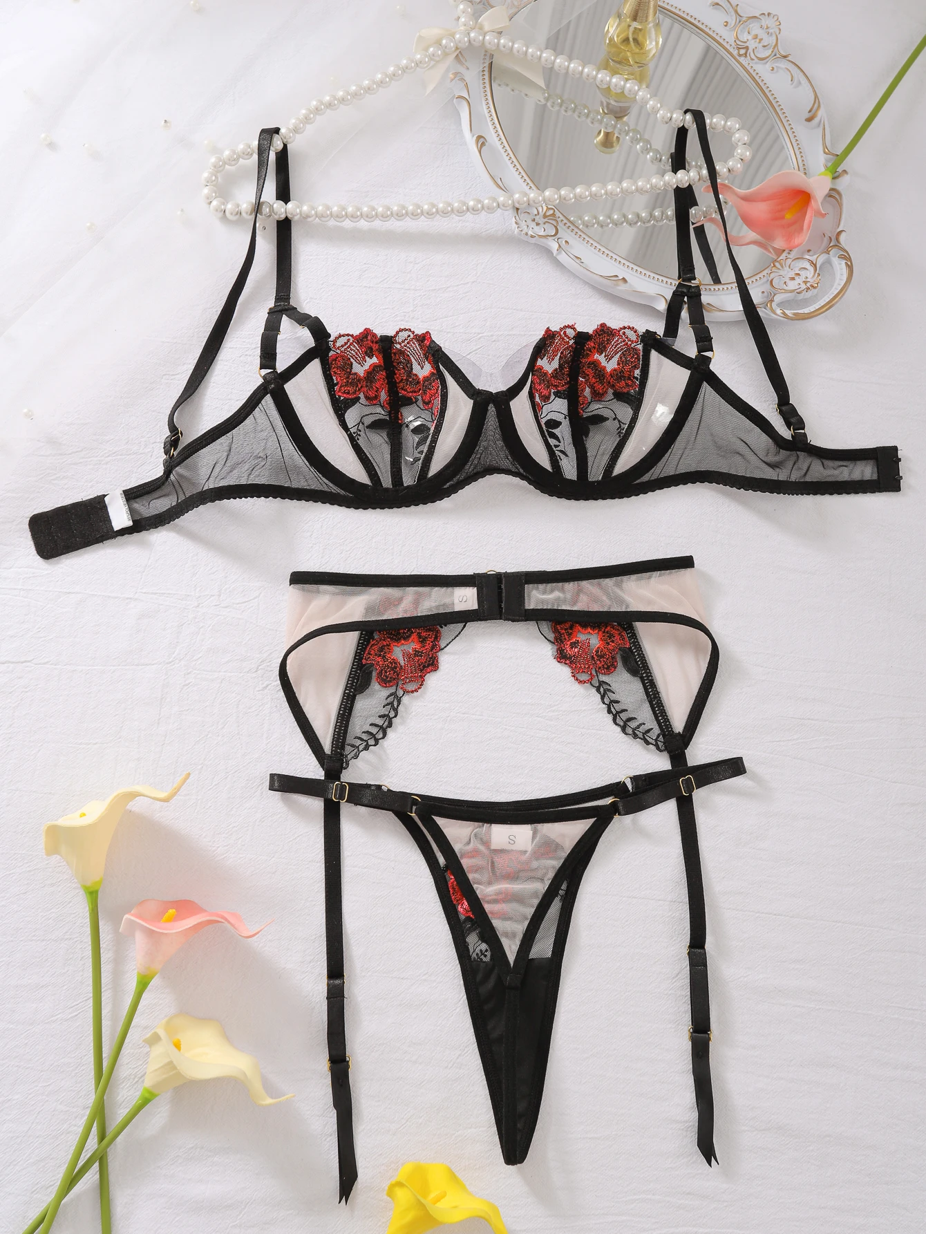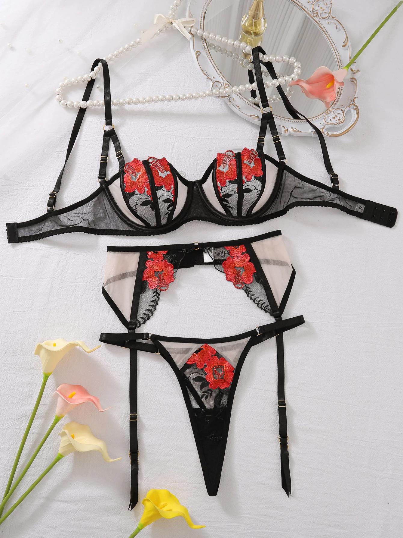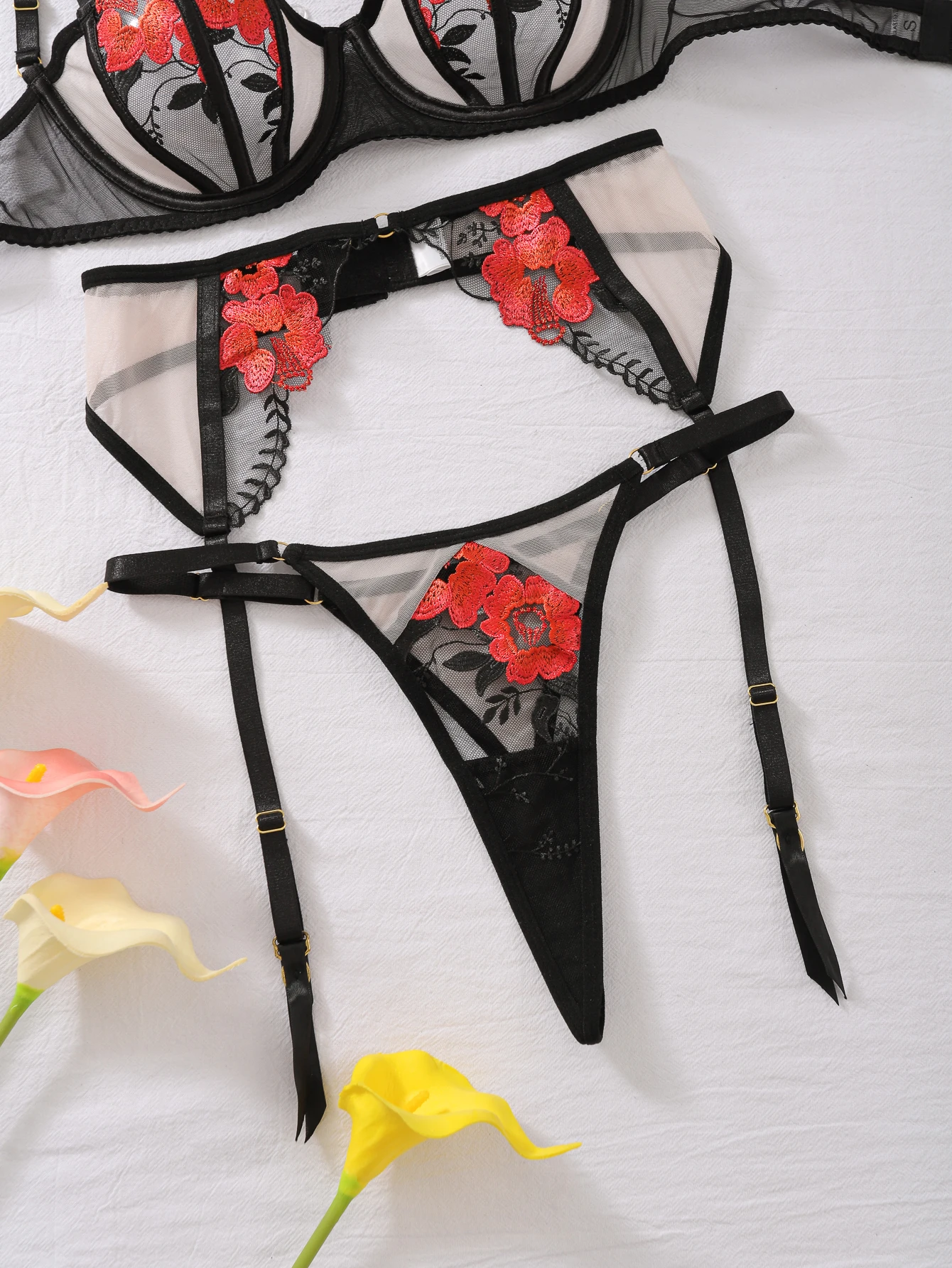 Luxury Ladies Bra Panty and Garter 3-Piece Set Sexy See-Through Mesh Floral Embroidery Backless Erotic Lingerie Set for Women