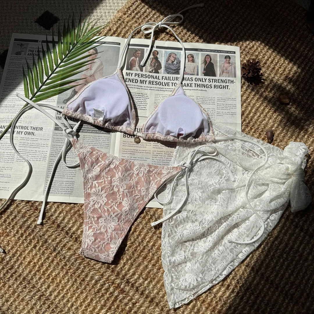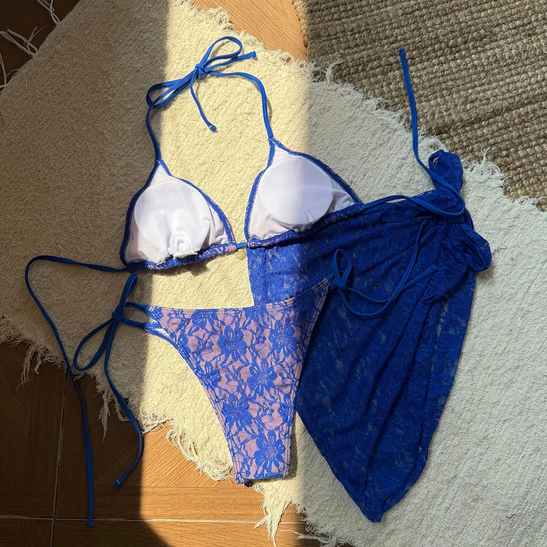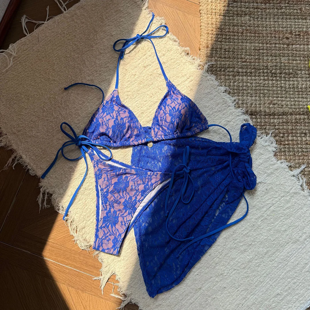 Mesh Sarong Lace Halter High Cut Bikini Women Swimwear Female Swimsuit Three-pieces Bikini set Bather Bathing Suit Swim V6284H