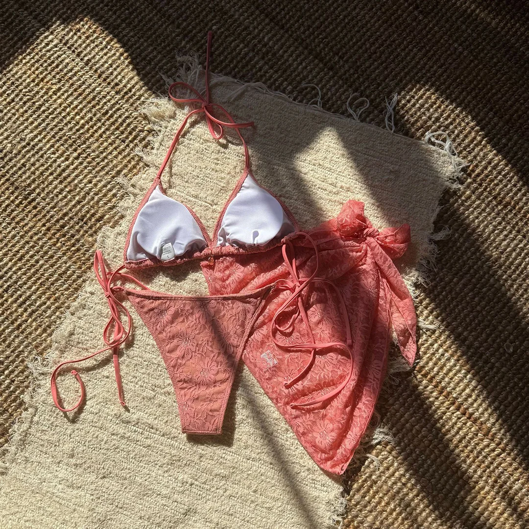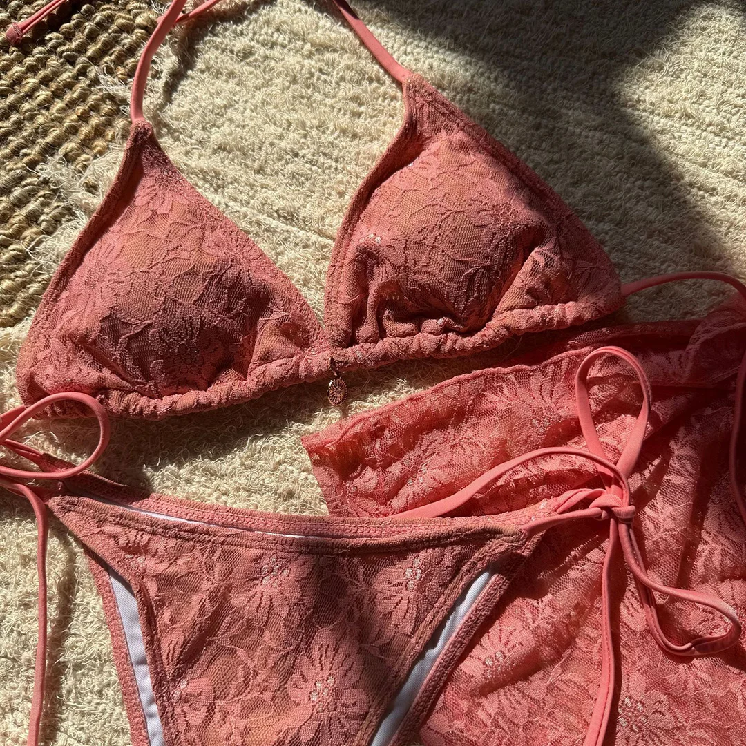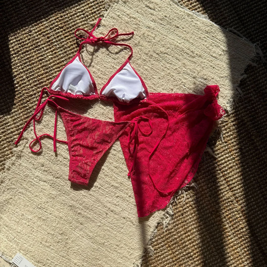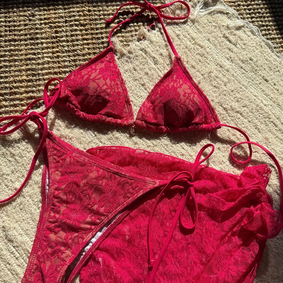 Mesh Sarong Lace Halter High Cut Bikini Women Swimwear Female Swimsuit Three-pieces Bikini set Bather Bathing Suit Swim V6284H