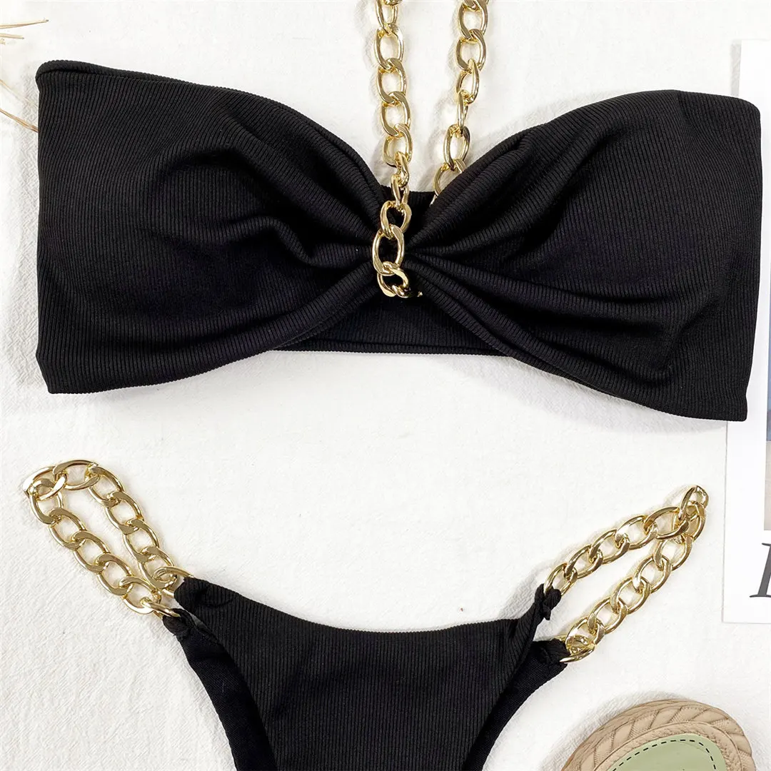 Metal Chain Halter Ribbed Bikini Women Swimwear Female Swimsuit Two-pieces Bikini set High Cut Bather Bathing Suit Swim V2989