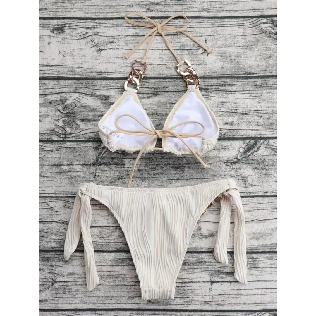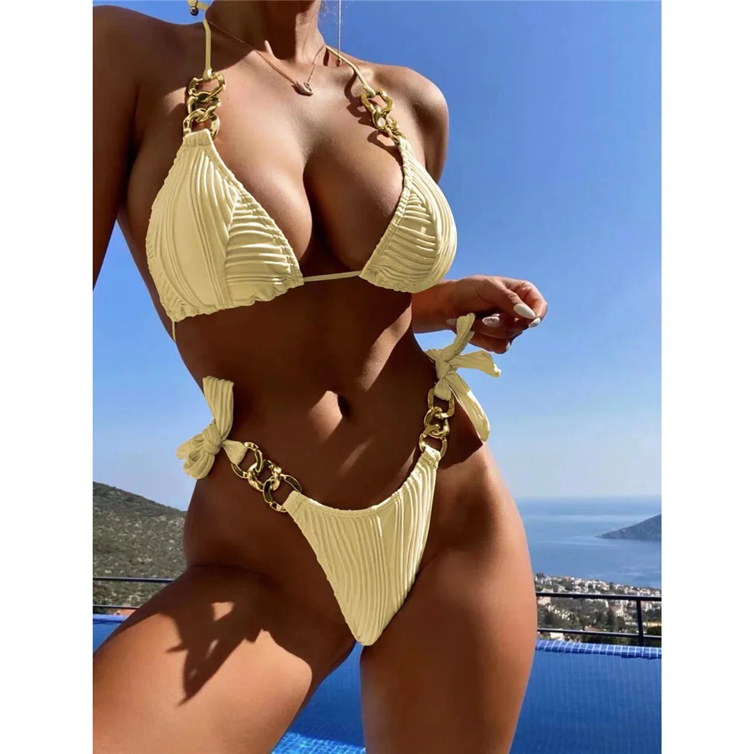 Metal Rings Halter Wrinkled Bikini Female Swimsuit Women Swimwear Two-pieces Bikini set Bather Bathing Suit Swim Lady V4149SW