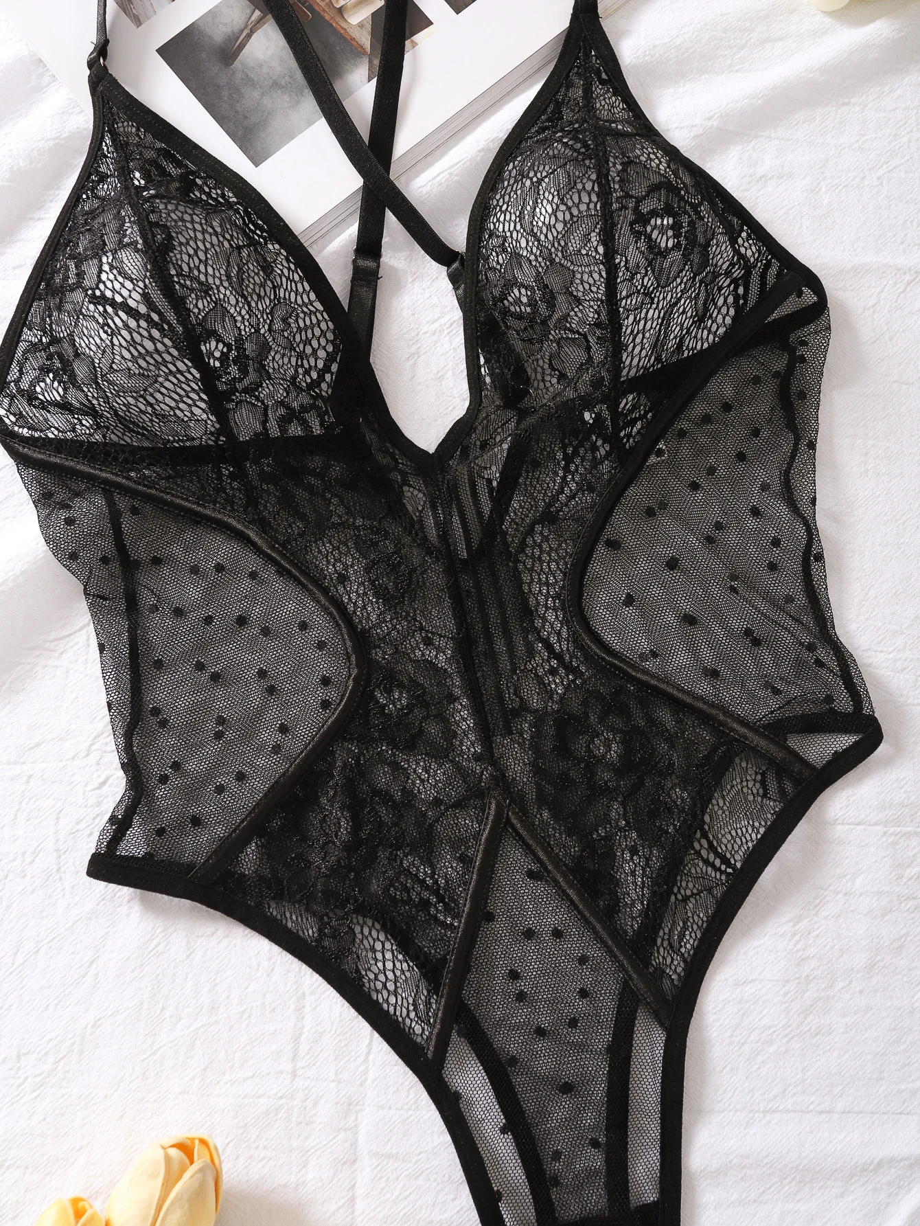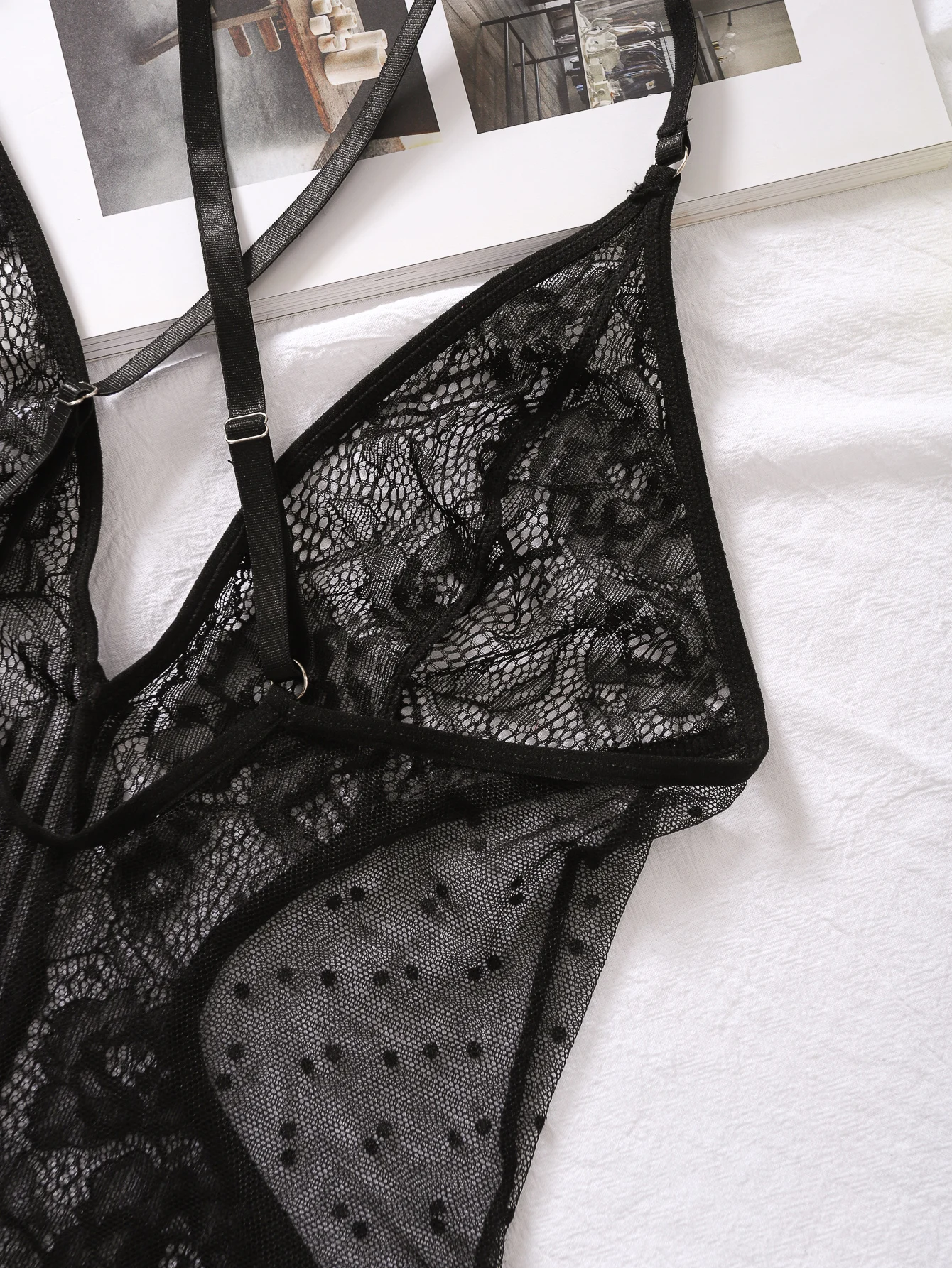 MUZISKAT 2024 Fashion New Sexy Lace Splicing Polka Dot Mesh See-Through Erotic Slimming Jumpsuit Women Onlyfans