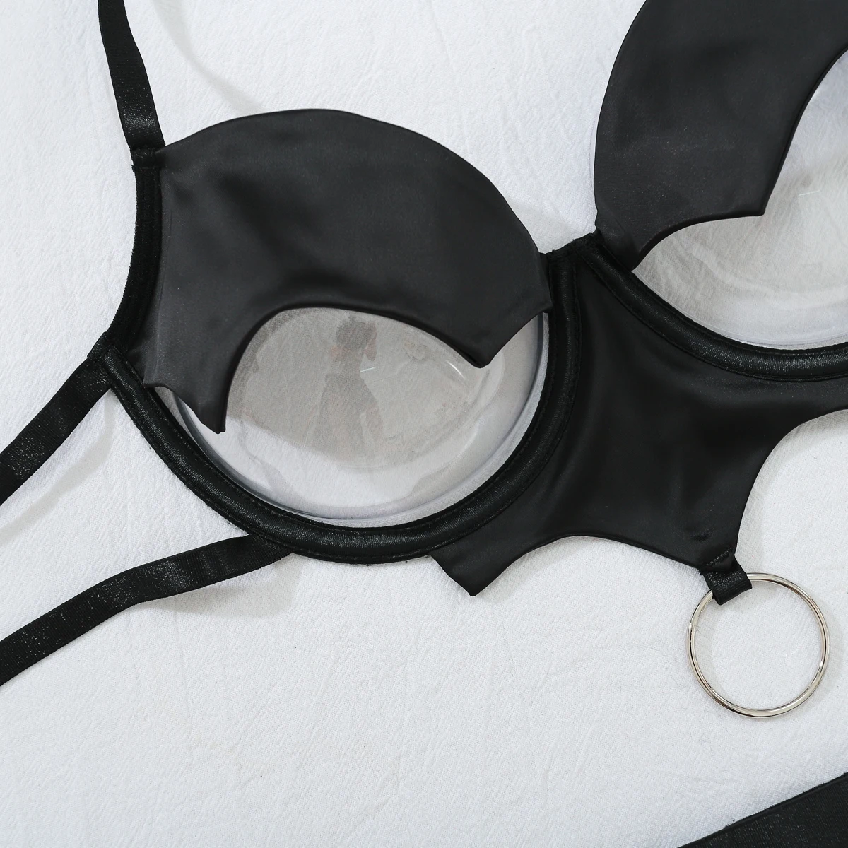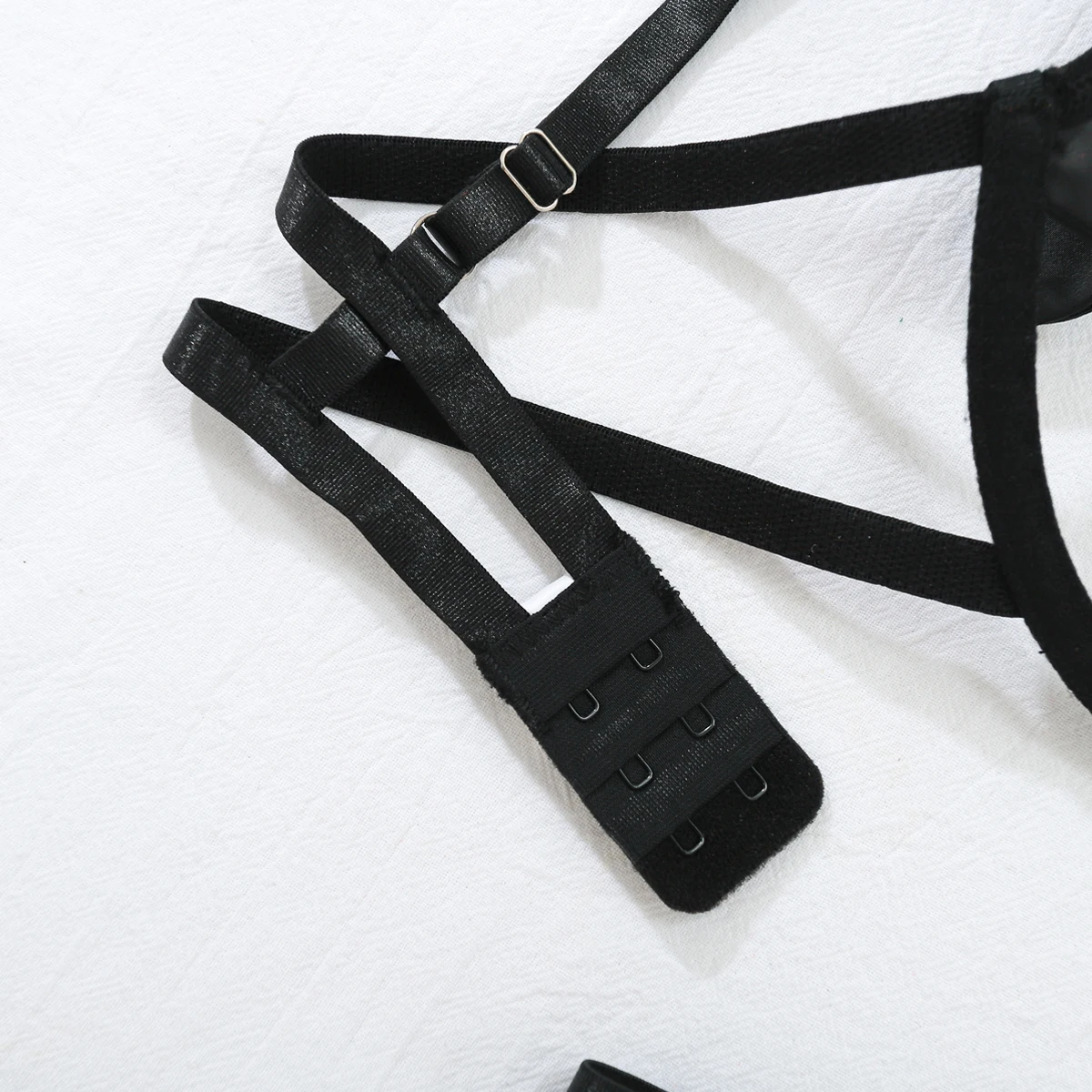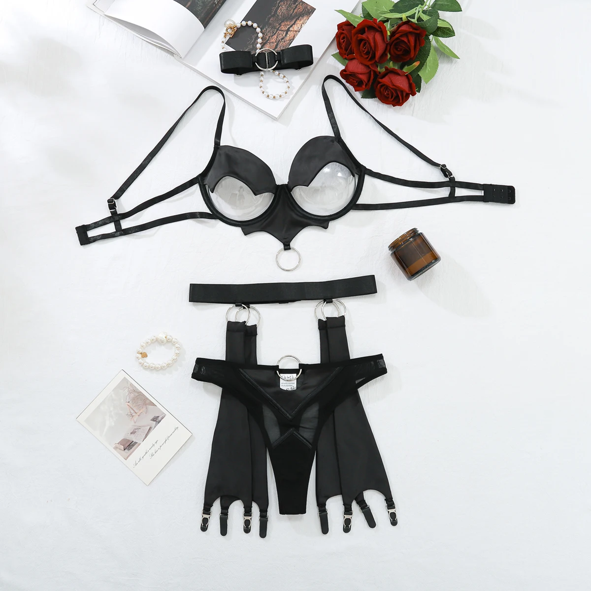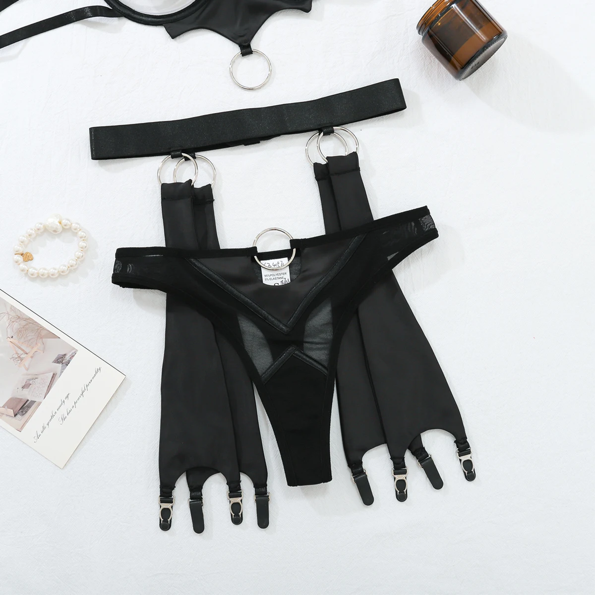 Muziskat 2024 New Sexy Lingerie Women Openwork Three-point bar Black Temptation Underwear four-piece Set