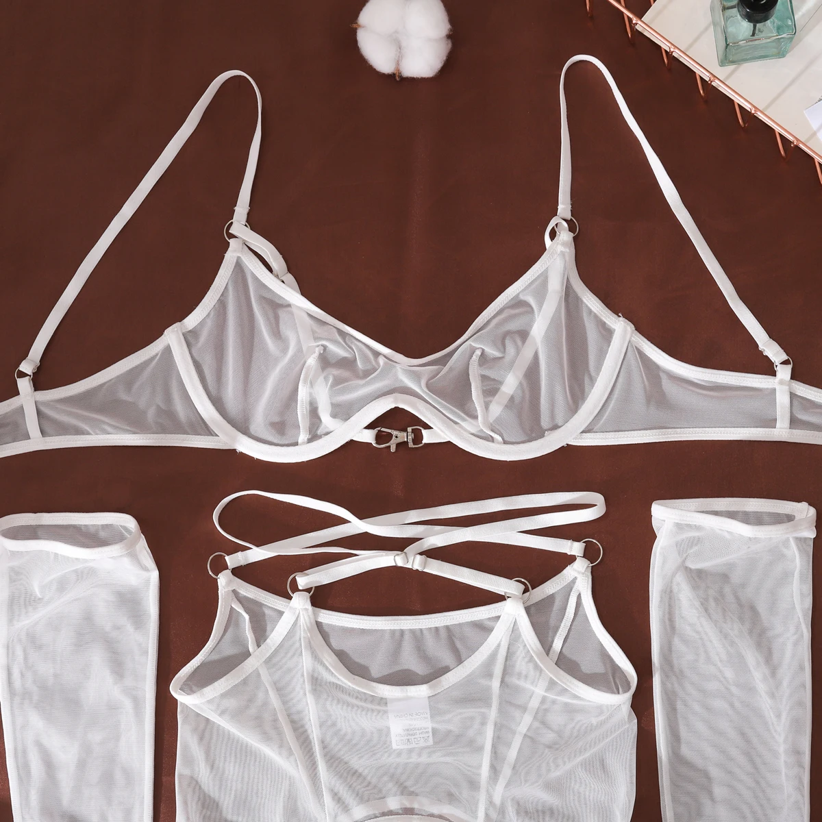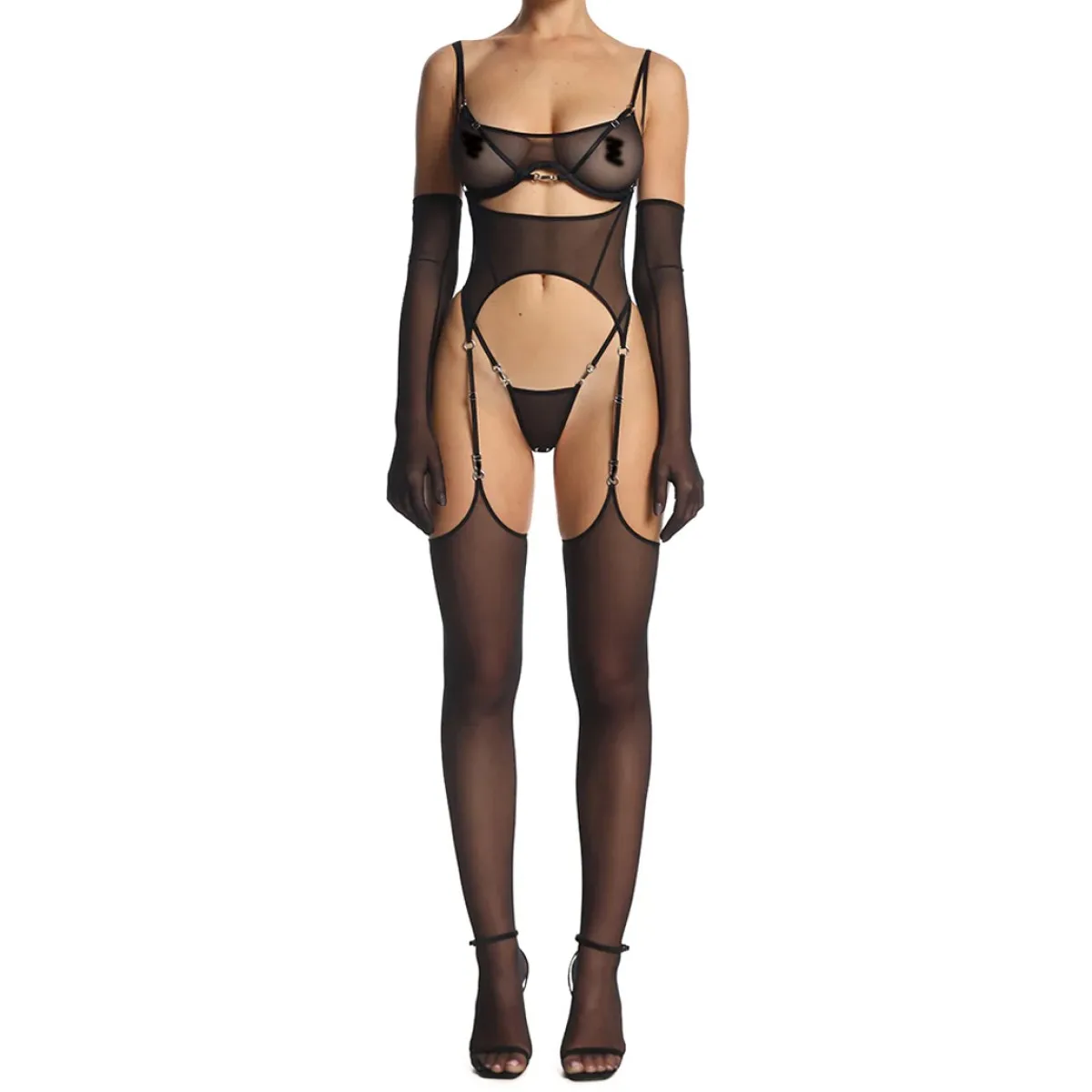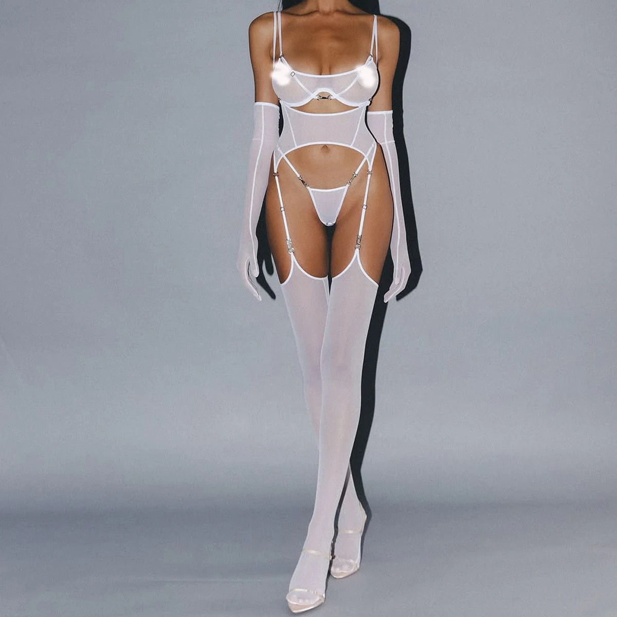 MUZISKAT 2025 Cross border Mesh Comfortable Breathable Belt with Stocking Body Shaping Ultra Thin Sexy Split Five Piece Set