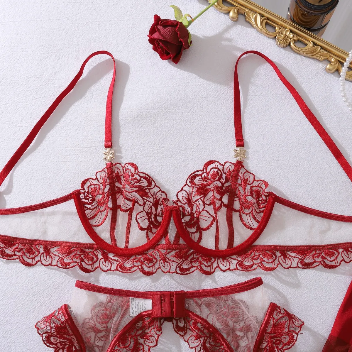MUZISKAT 2025 sexy floral embroidery luxury 4-piece set perspective gathering shaping sexy split stockings set