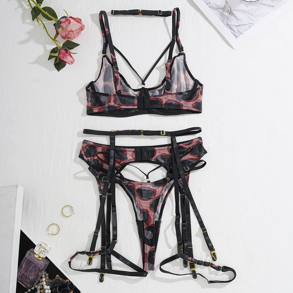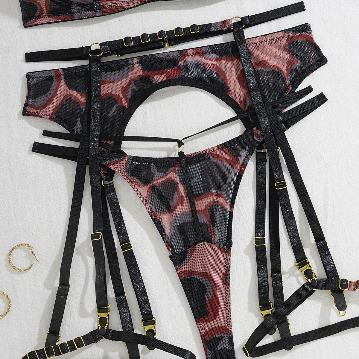 MUZISKAT 2025 Women’s Sexy Lingerie Leopard Print Gathered Hollow Lingerie Fashion Hottie Garter Belt Erotic six-piece Set