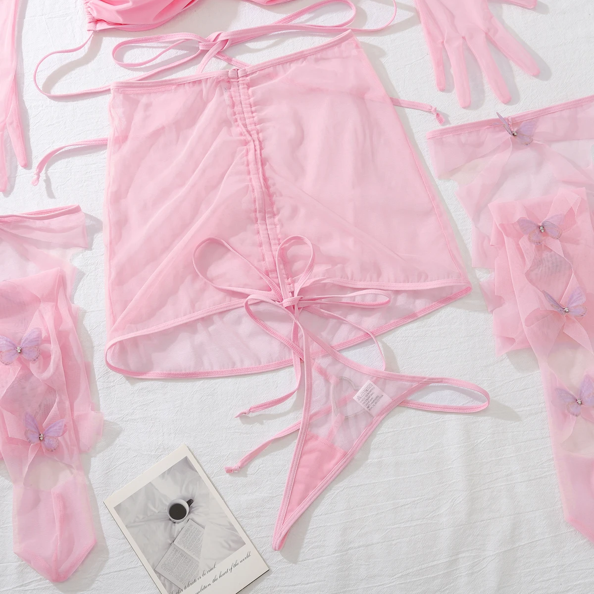 Muziskat Explosive Lingerie Ladies Erotic Set Skeleton Mesh Seduction Sexy Elegant Pink Neck Lingerie Five-piece Set