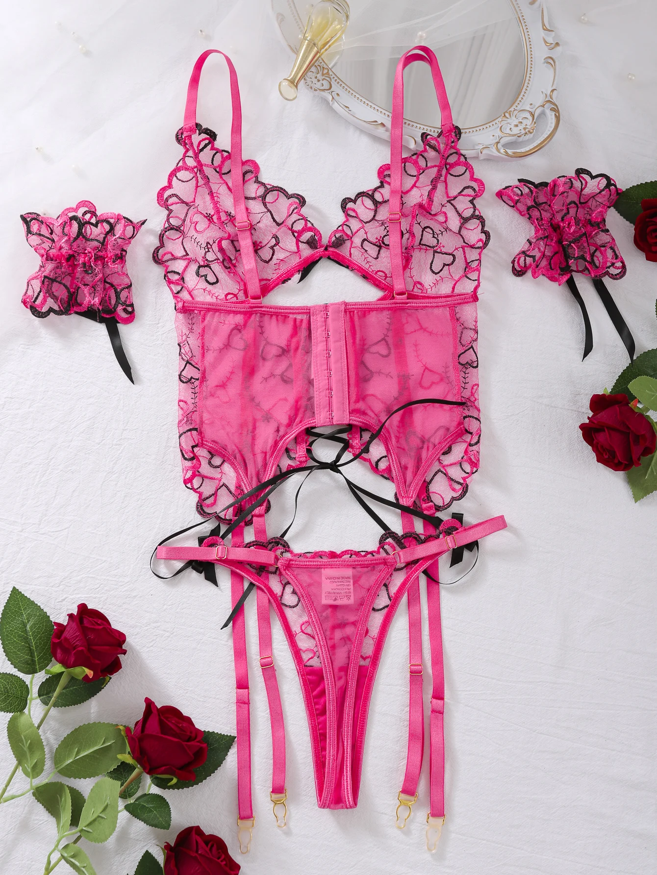 MUZISKAT Mesh Erotic Women’s Lingerie Set Lace See Through Sexy Heart Shape Embroidery Underwear and Thong Porn 3 Pieces Suit