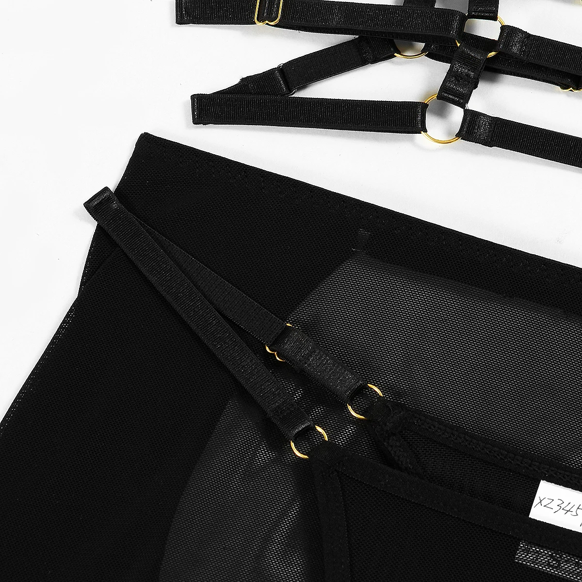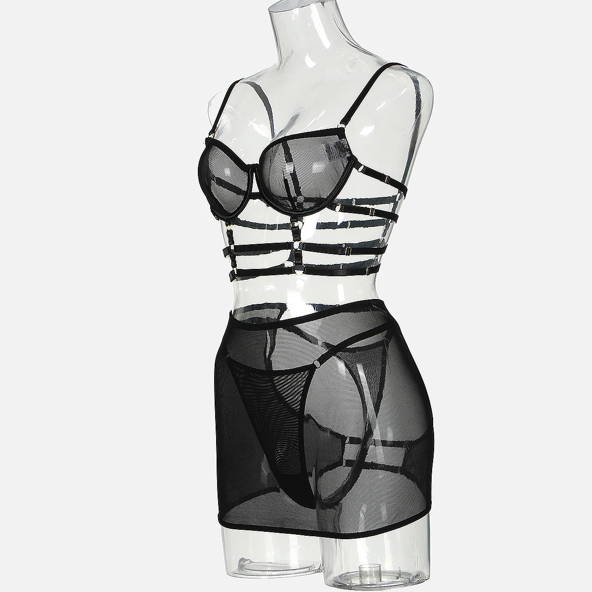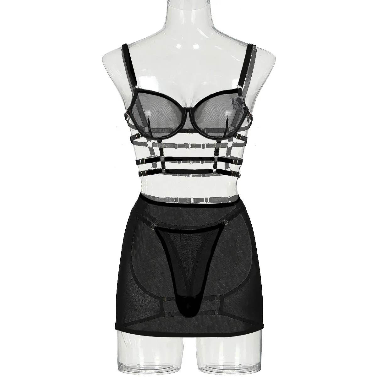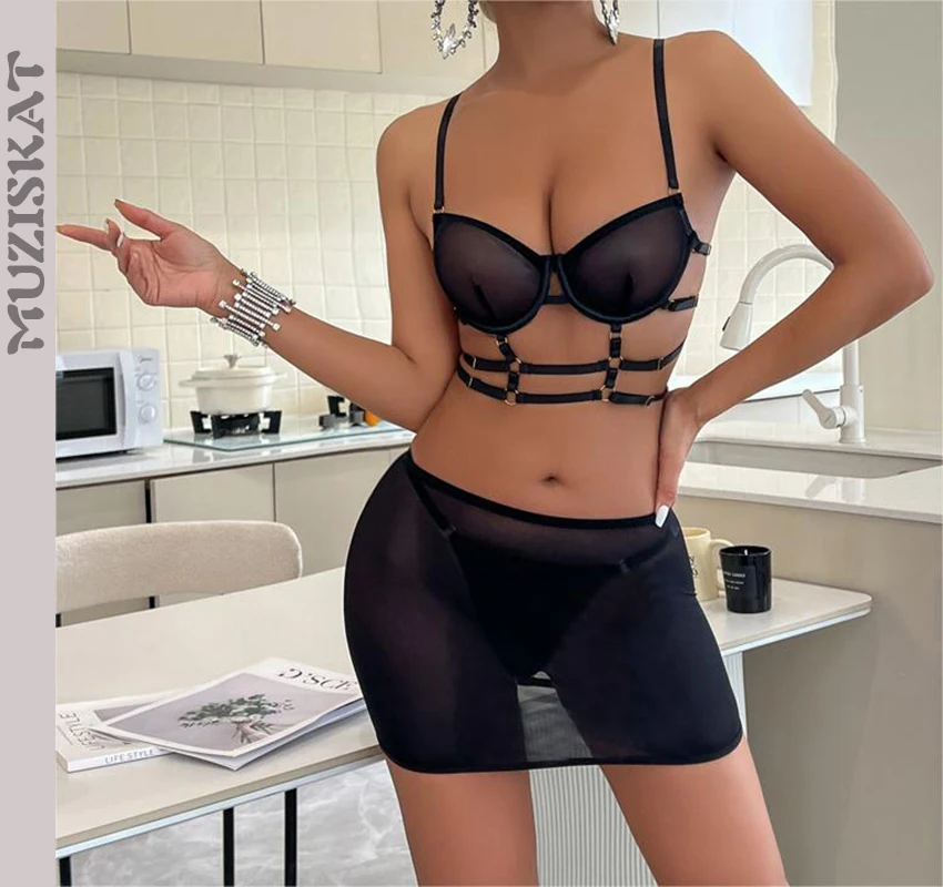 MUZISKAT Sexy Shapewear Short Dress Set Comfortable Mesh Skeleton Straps Bra Hollow Backless Erotic Lingerie three-piece Set