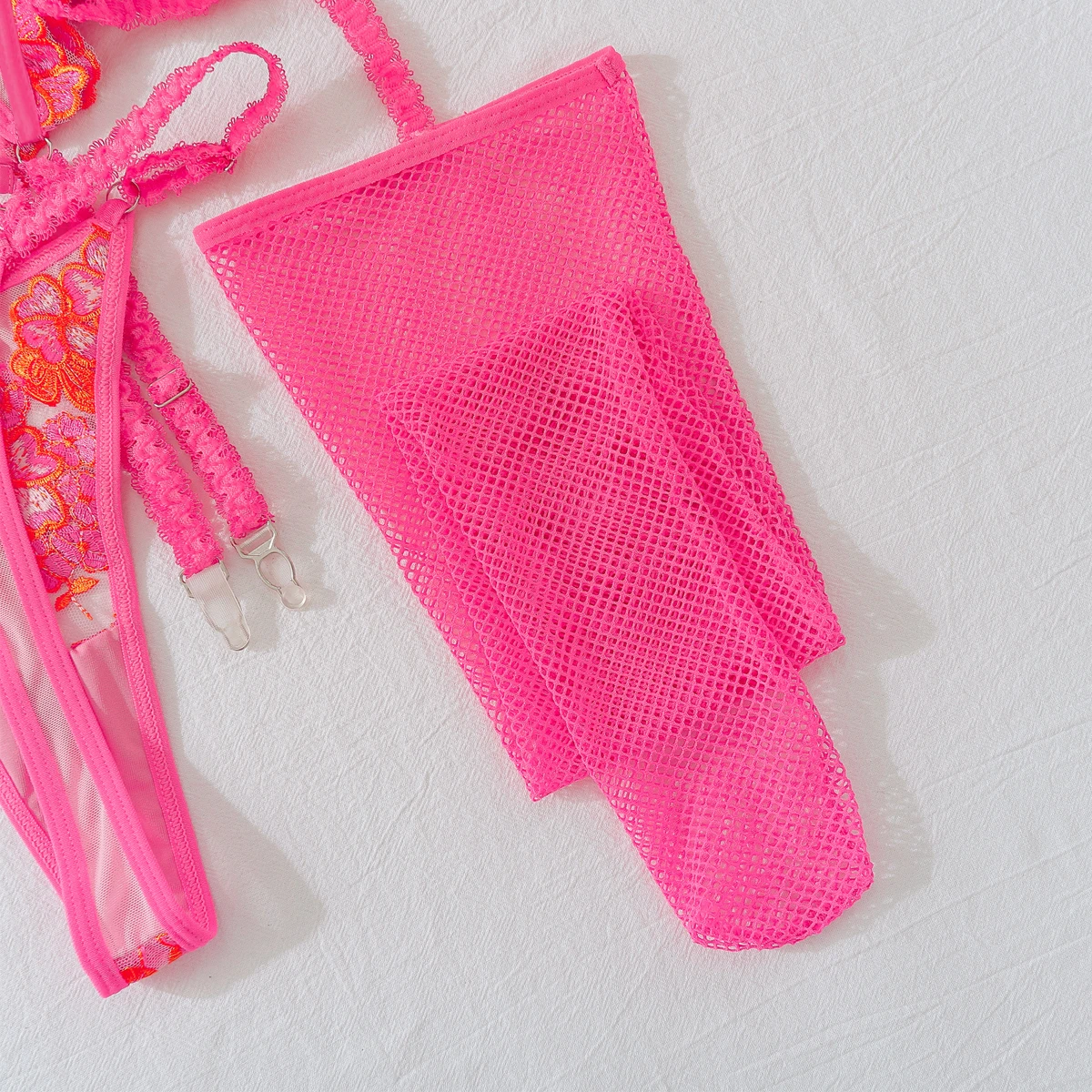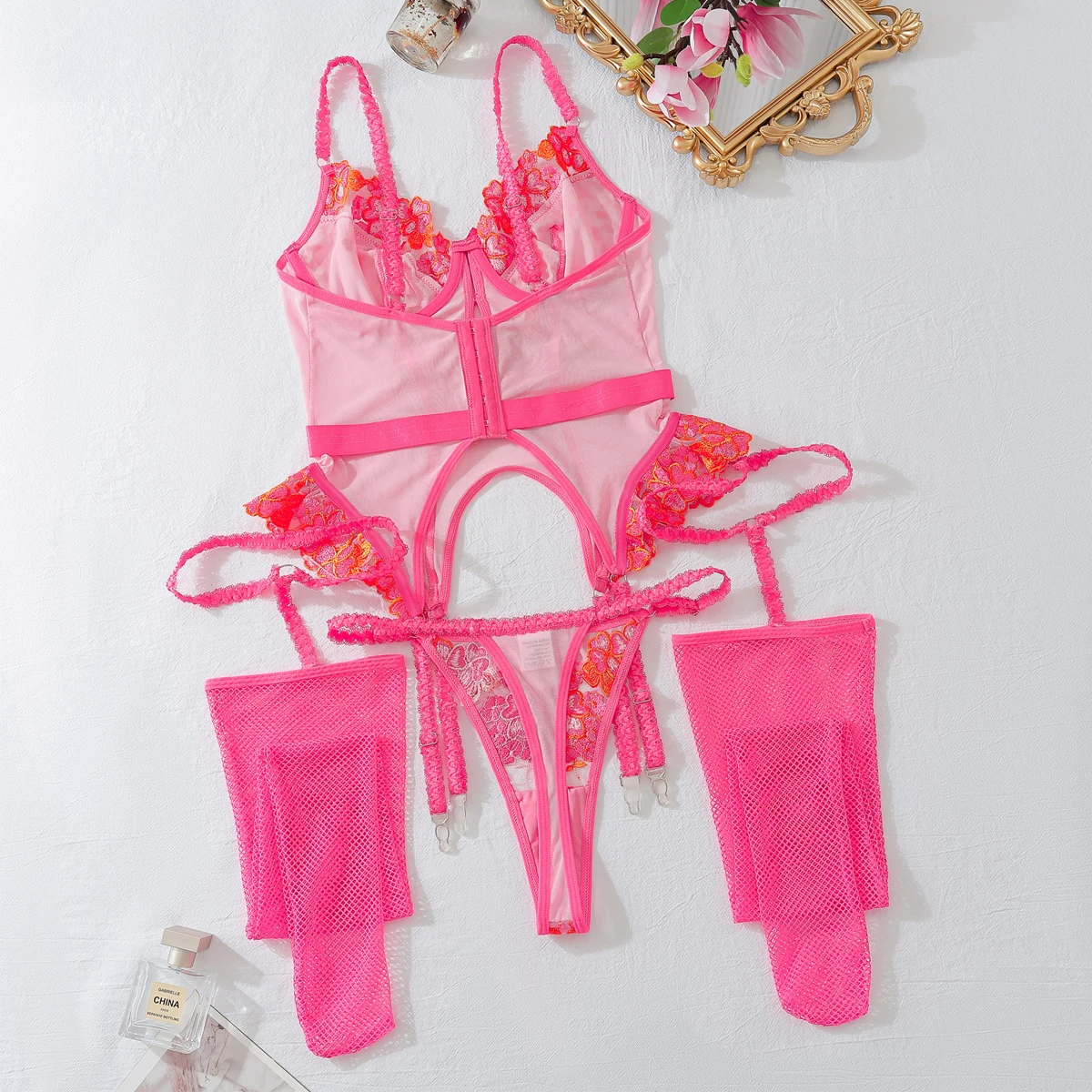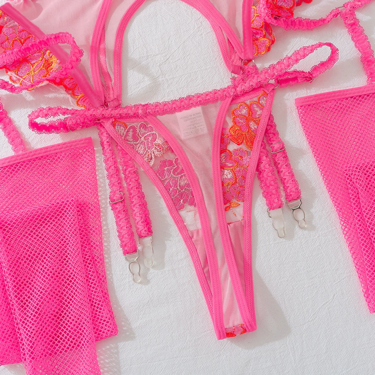 MUZISKAT Transparent Tulle Embroidered Bra And Brief Women’s Underwear Set With Stockings Fashion Sexy Lingerie Women Set
