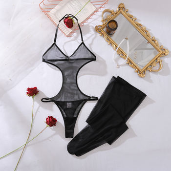 New ultra-thin see through mesh crotch jumpsuit for slimming and sexy hanging neck underwear with stockings
