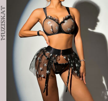 MUZISKAT Erotic Lingerie Set 2024 Fashion Star Print See-Through Mesh Sexy Lingerie Three Pieces Onlyfans