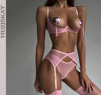 MUZISKAT Erotic Lingerie Exposed Breast With Breast Stickers Sexy See-Through Mesh Peach Buttocks Four-Piece Female