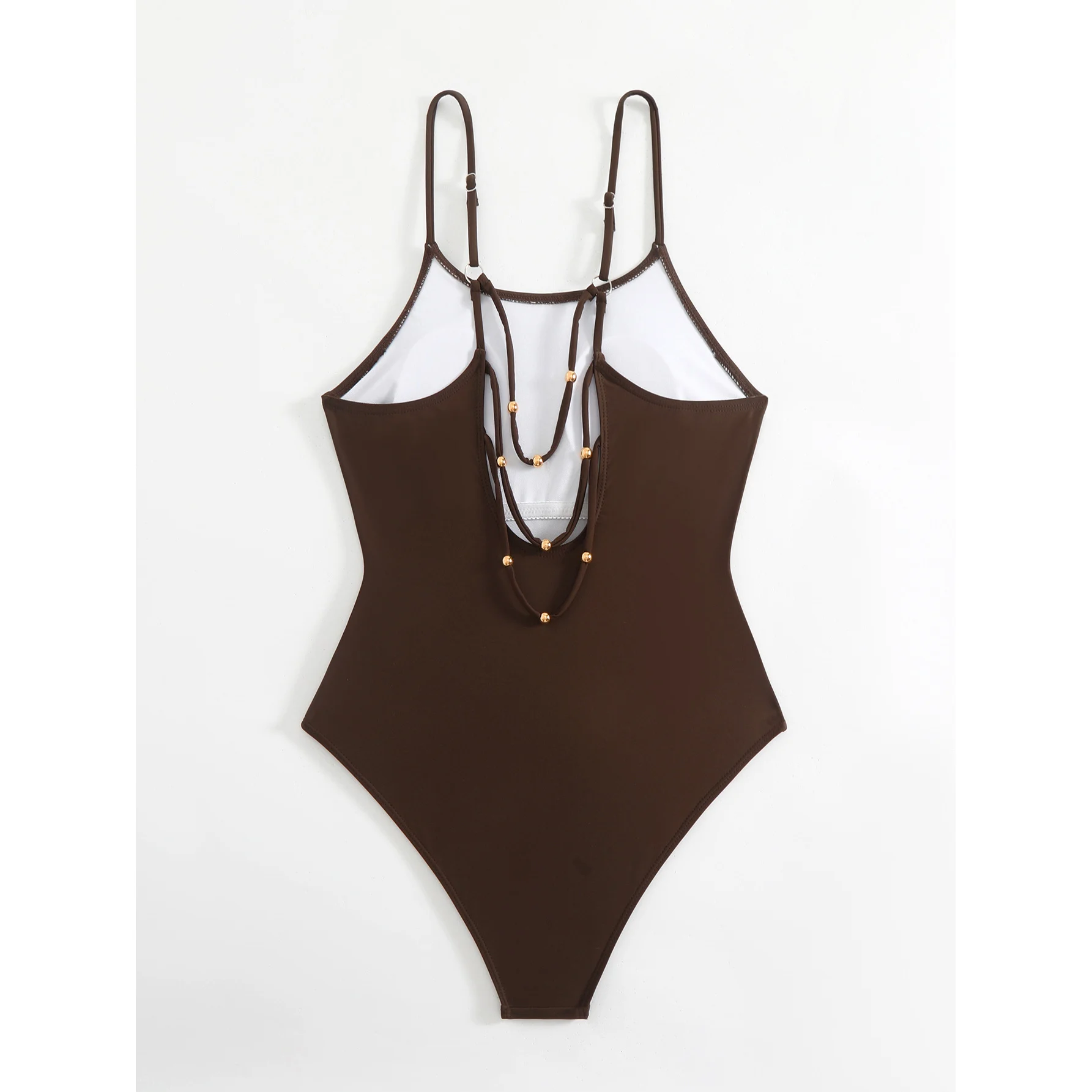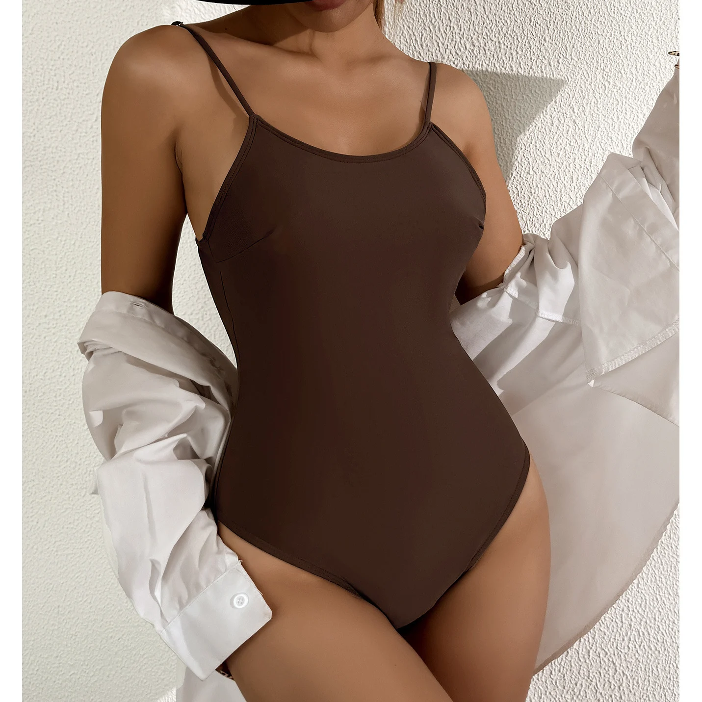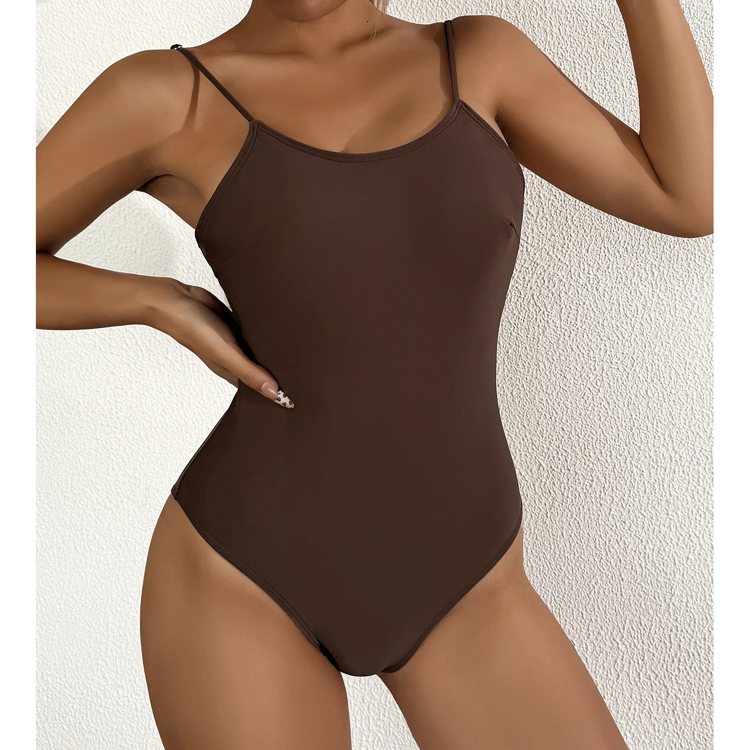 New 2025 Sexy Backless High Leg Cut Women Swimwear One Piece Swimsuit Female Padded Solid Coffee Bather Bathing Suit Swim V7089