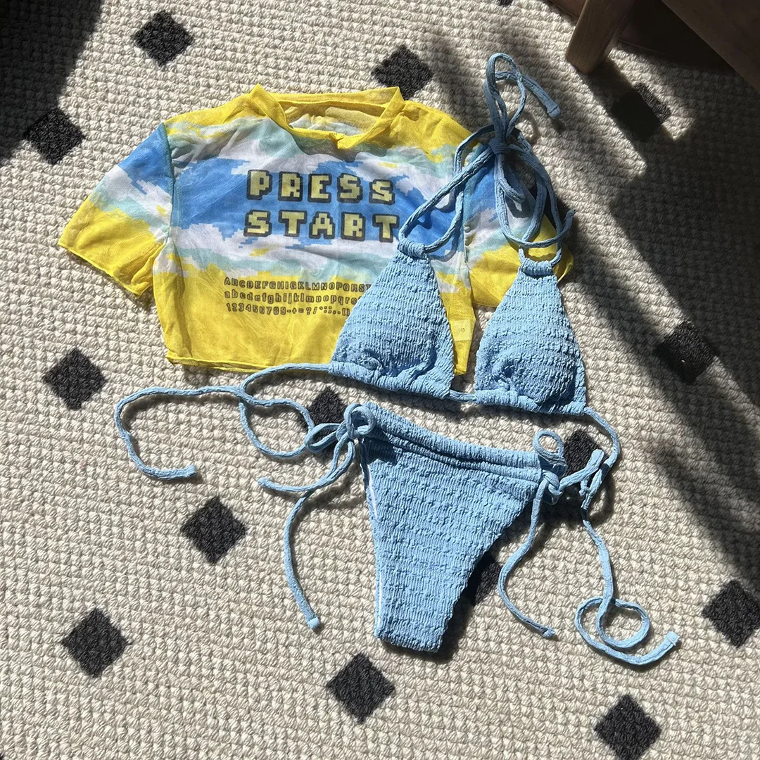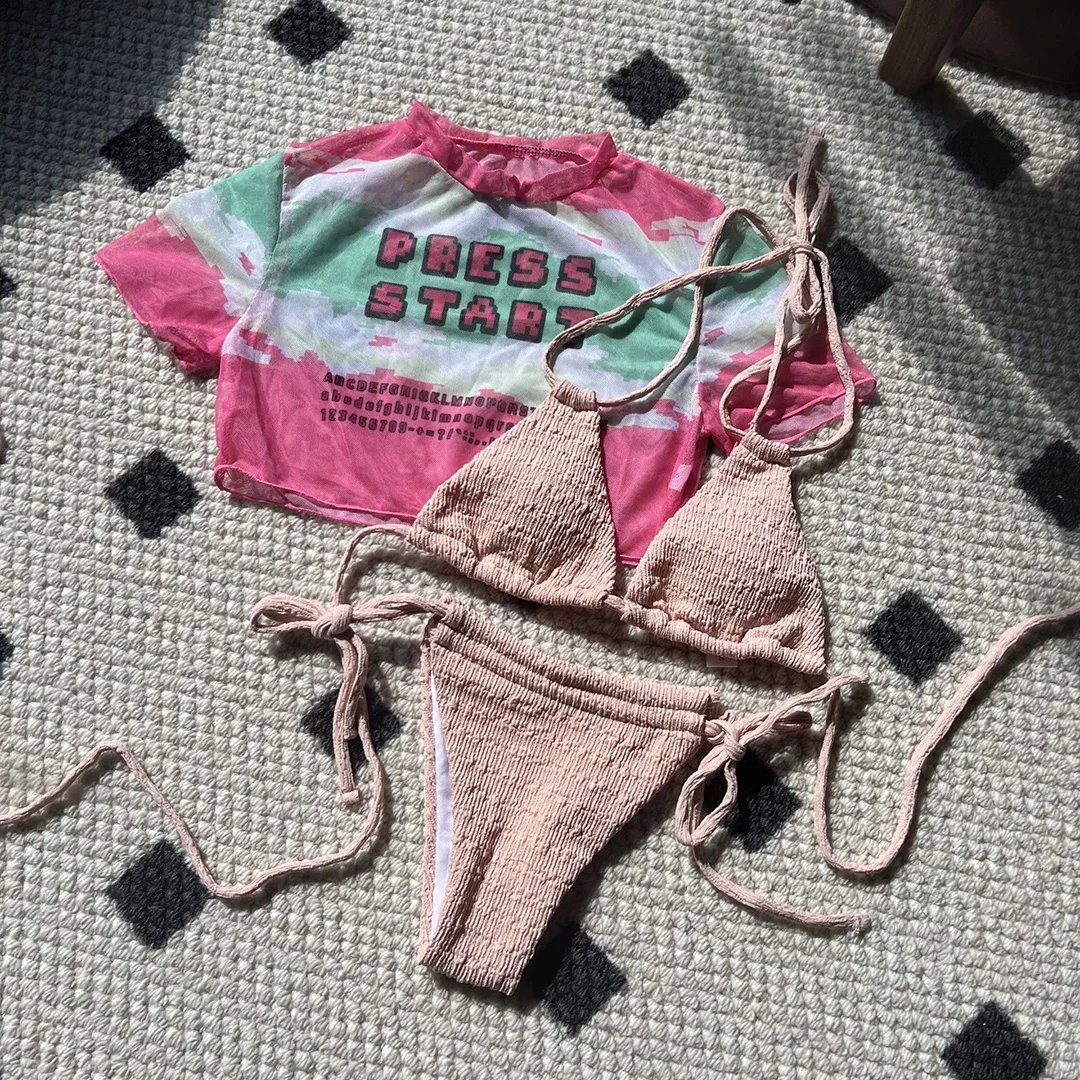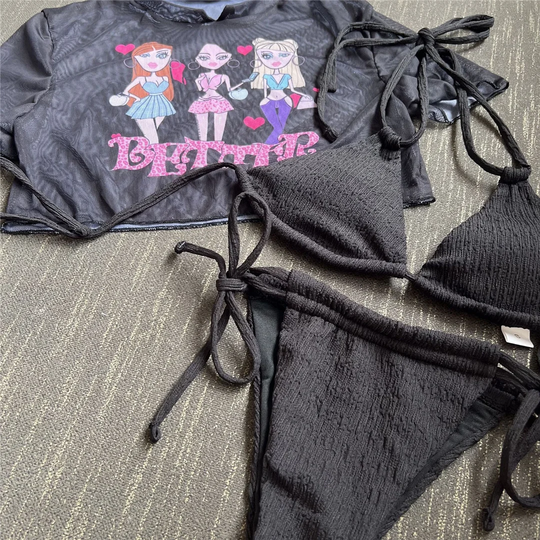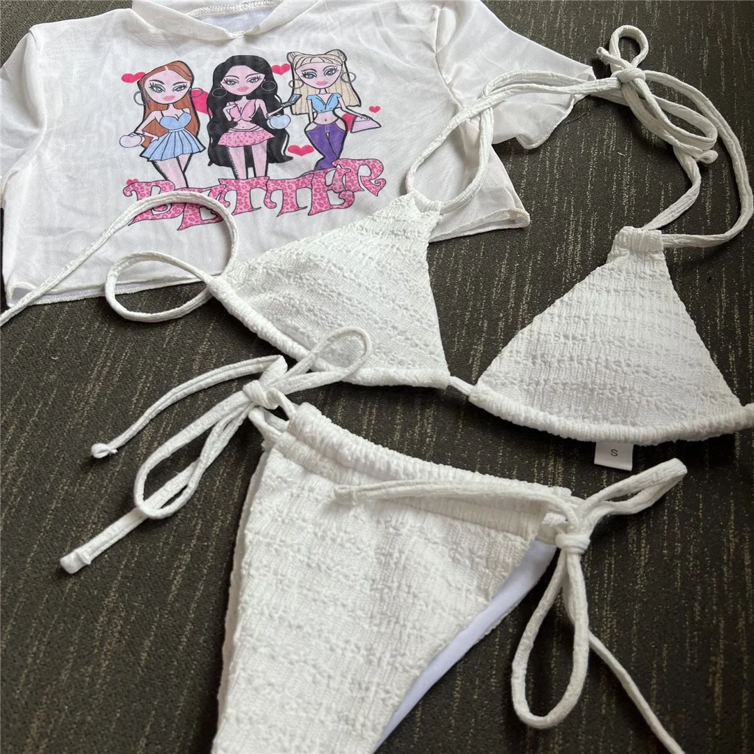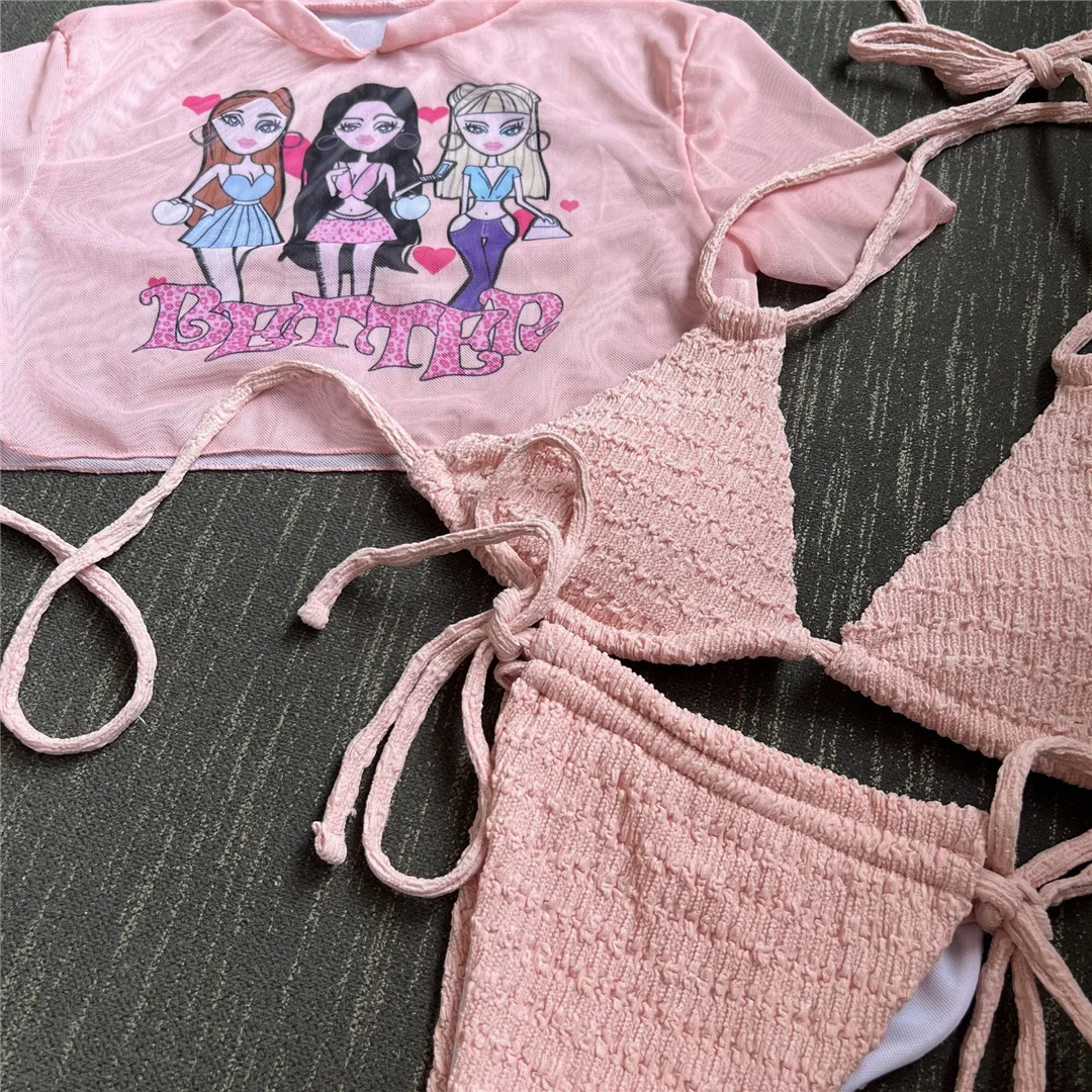 New Cartoon Short Sleeve Halter Strappy Bikini Female Swimsuit Women Swimwear Three-pieces Bikini set Bather Bathing Suit V4816